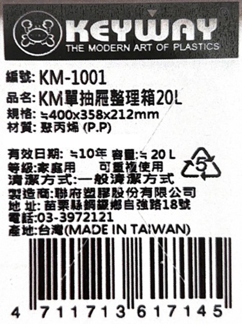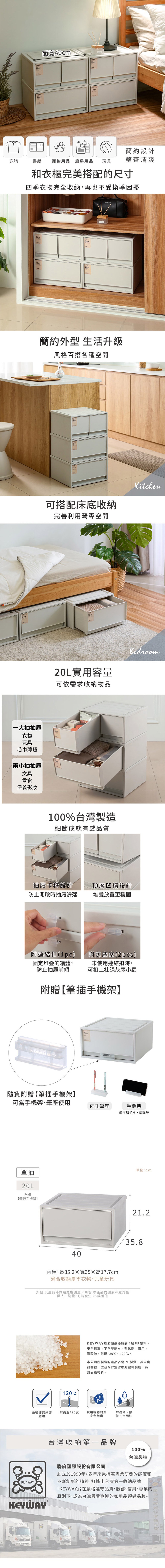KEYWAY聯府KM單抽屜整理箱,採用簡約設計,能輕易融入各種居家風格。20L的容量,適合收納各式物品,讓居家空間更加整齊。抽屜卡榫設計,防止抽屜滑落,頂層凹槽設計,堆疊放置更穩固。附連結扣,可固定堆疊的箱體,防止抽屜前傾。100%台灣製造,品質有保障,讓您收納更安心。