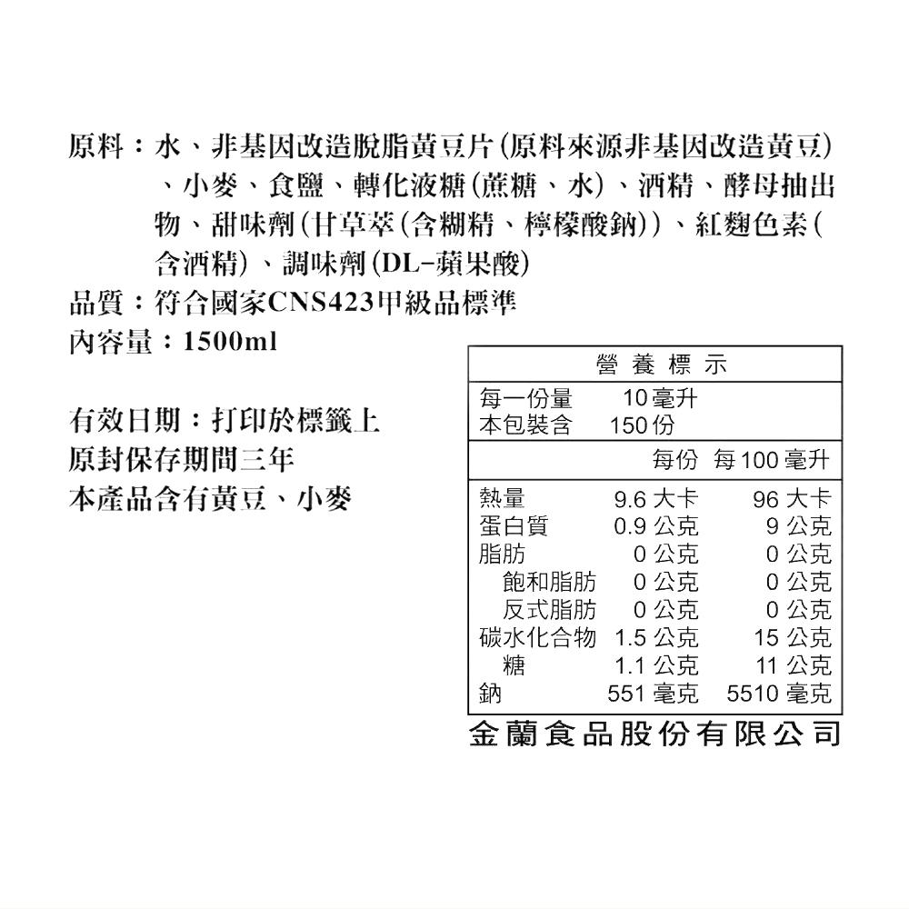 - 採用非基因改造黃豆釀造,金蘭醬油保證安心食用,讓您在享受美食的同時,也能兼顧健康。