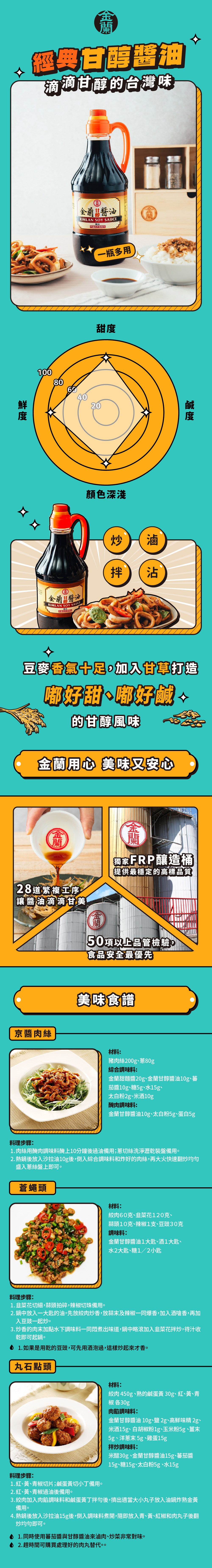 - 獨特甘醇風味,不死鹹,不死甜,金蘭醬油能為您的菜餚增添層次感,讓您回味無窮。