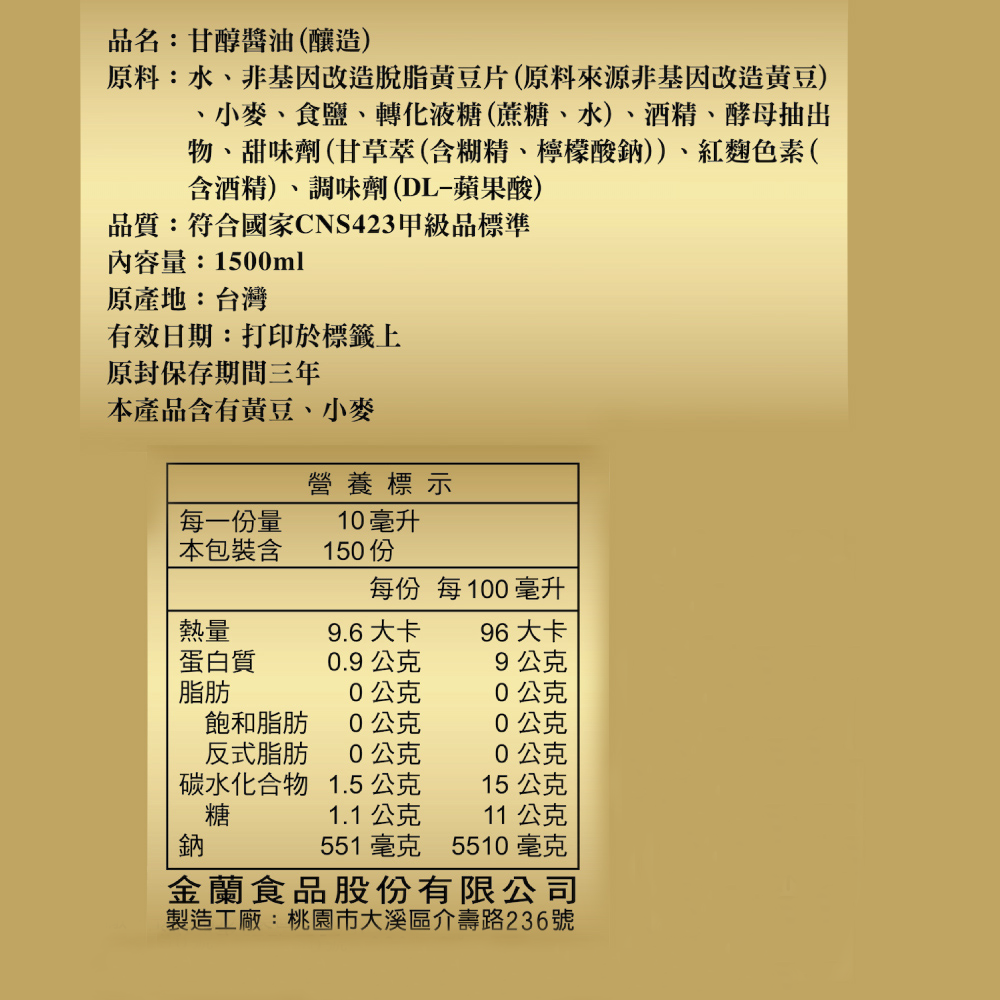 - 採用非基因改造黃豆釀造,金蘭醬油保證安心食用,讓您在享受美食的同時,也能兼顧健康。
