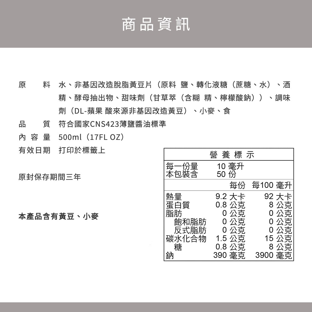 - 嚴選非基因改造黃豆釀造,安心食用,為家人健康把關。