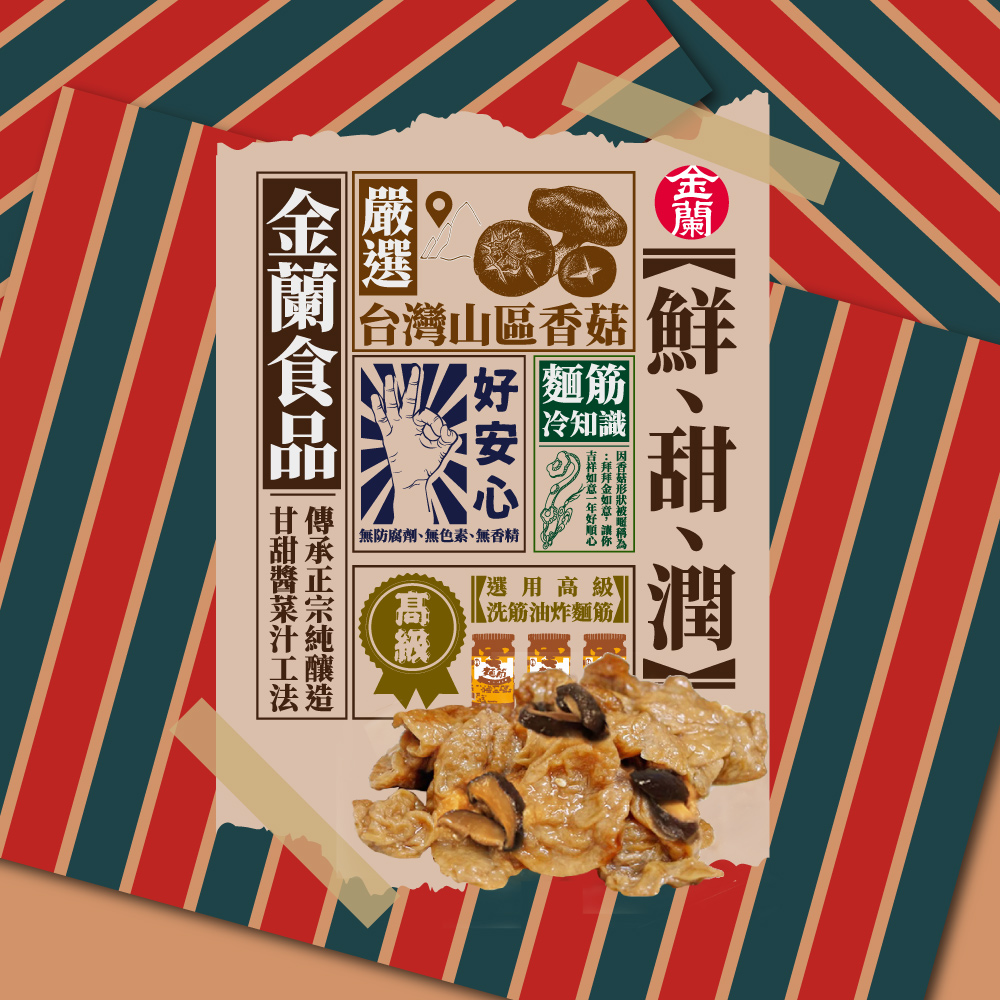 - 金蘭香菇麵筋,口感鮮甜,搭配稀飯或粥品,讓您輕鬆享受美味早餐,開啟美好的一天。