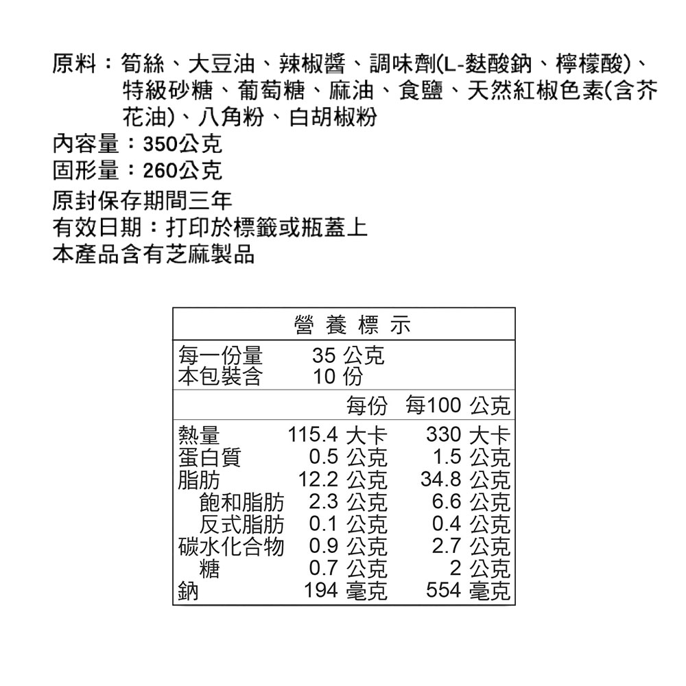 | 成分(牛肉/豬肉需單獨標明來源國) | 筍絲、大豆油、辣椒醬(辣椒、食鹽、水)、調味劑(L-麩酸鈉、檸檬酸)、特級砂糖、葡萄糖、麻油、食鹽、天然紅椒色素(含芥花油)、八角粉、白胡椒粉 | 製造商或國內負責商名稱 | 金蘭食品股份有限公司 |