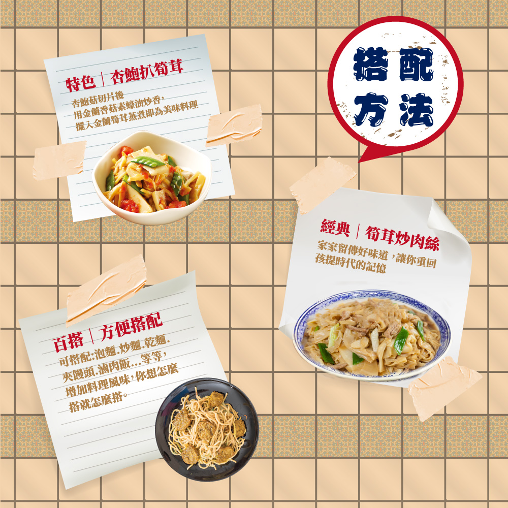 - 無論是搭配稀飯、拌麵、佐餐小菜,金蘭筍茸都能為您的餐點增添風味,讓您食慾大開,享受美食。