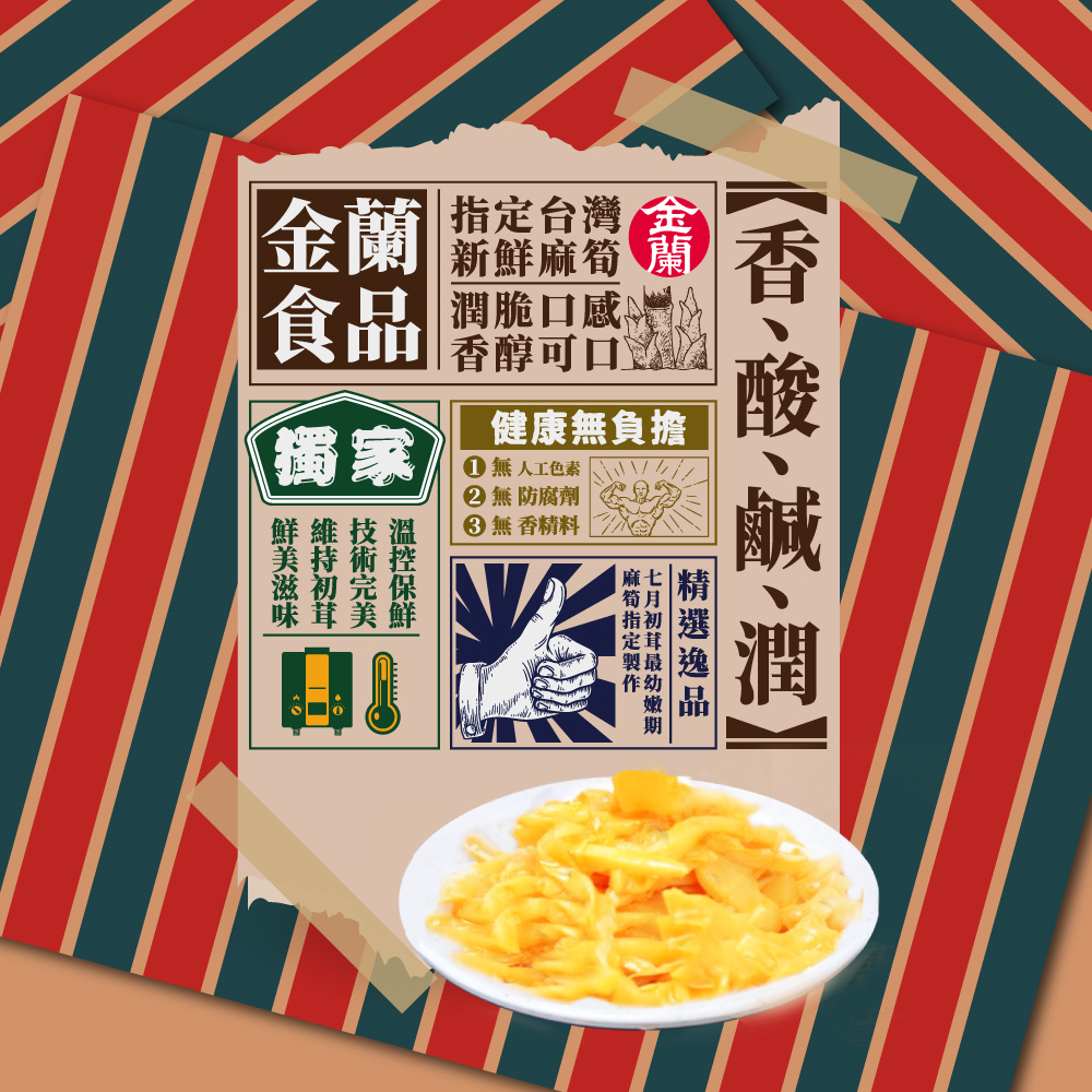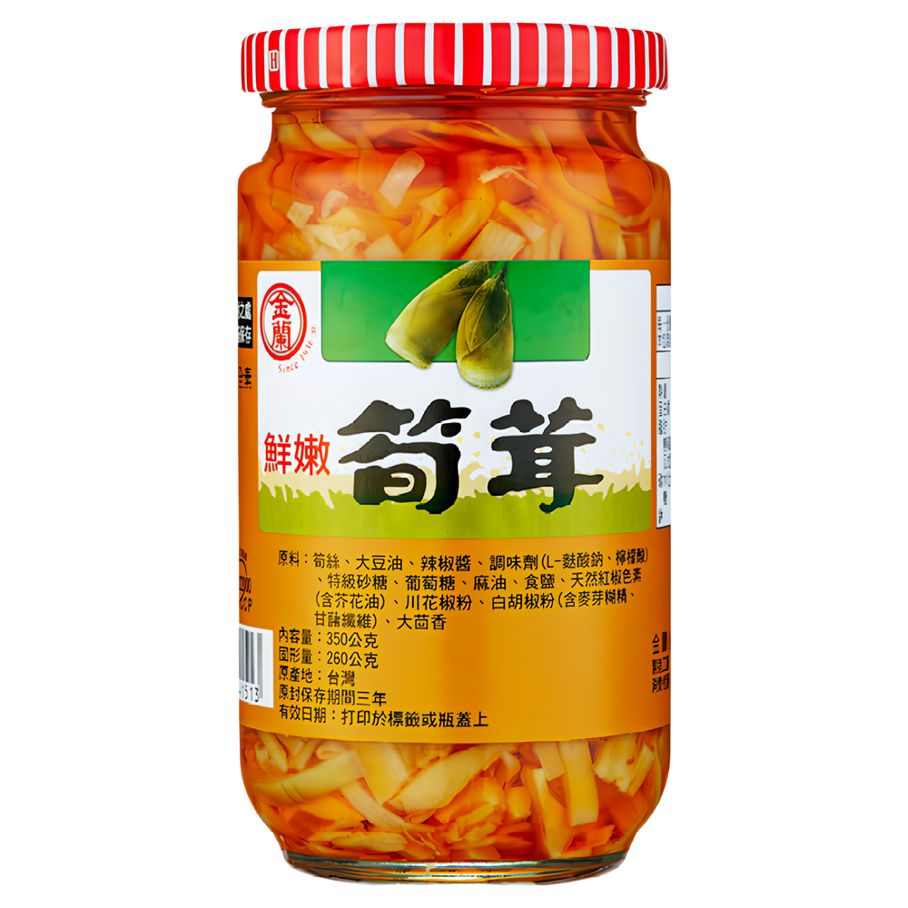 - 金蘭鮮嫩筍茸,口感清脆,滋味鮮美,讓您輕鬆享受道地台灣風味,隨時開罐,美味立即上桌。