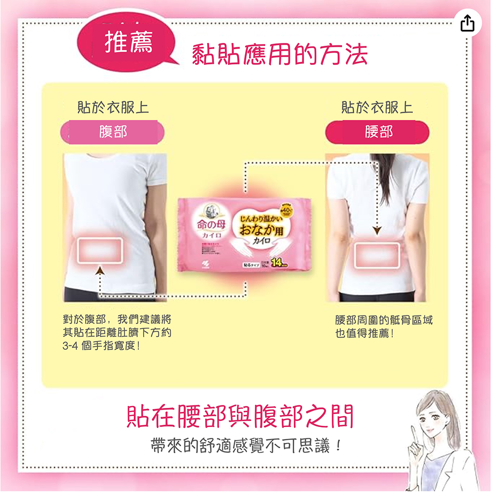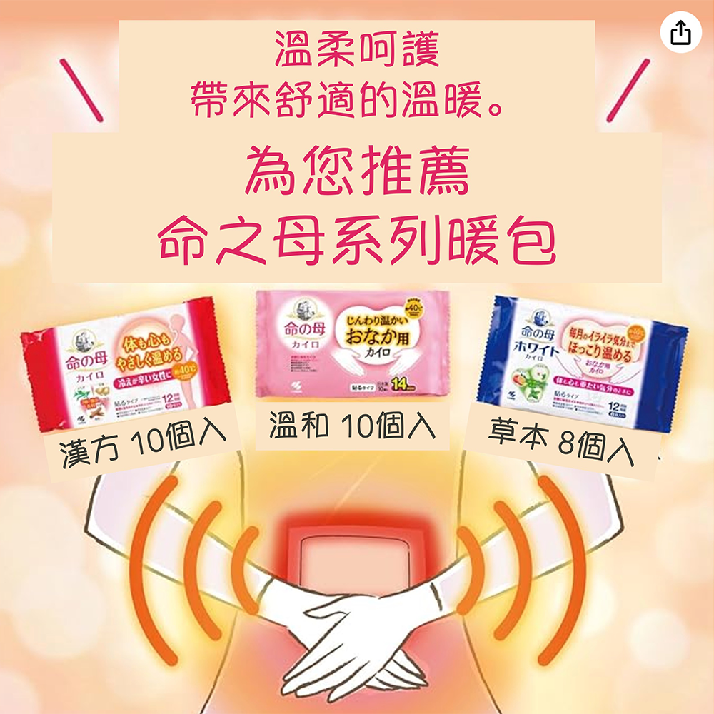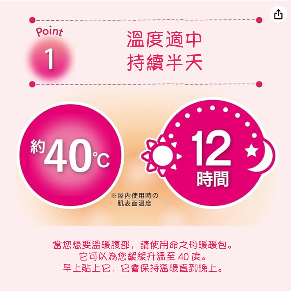 - 小林製藥命之母暖暖包提供約40℃的溫和熱度,長時間使用也不會感到過熱不適。
