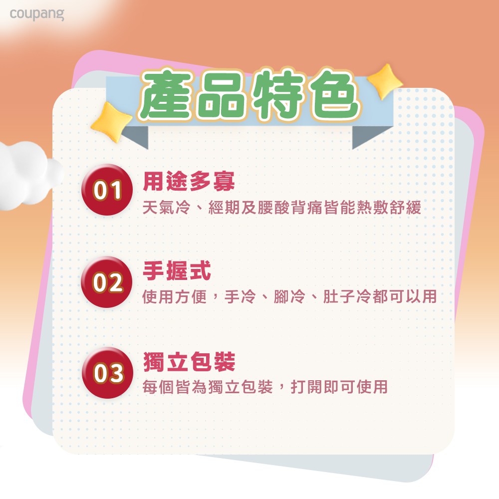- 手握式設計方便使用,無需黏貼,讓您自由調整溫暖部位,隨心所欲。