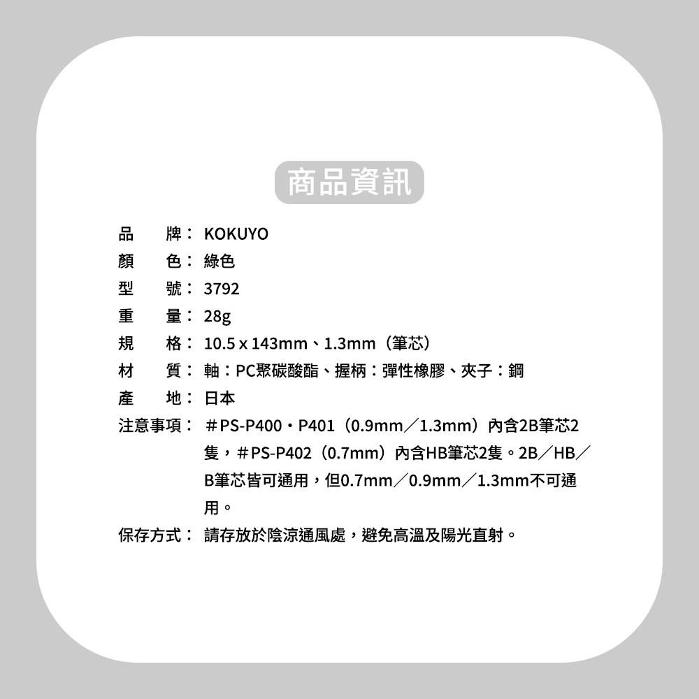 KOKUYO Type M自動筆,型號#3792,採用1.3mm筆芯,提供流暢且粗獷的書寫體驗,特別適合創意發想和草圖繪製。綠色筆身搭配橡膠握柄,確保長時間使用也能保持舒適穩定的握持感。此款自動筆不僅外觀時尚,更注重實用性,是學生、設計師和任何需要頻繁書寫人士的理想選擇。KOKUYO品牌以其高品質和創新設計而聞名,這款Type M自動筆也不例外,展現了卓越的工藝和對細節的關注。無論是日常書寫還是專業繪圖,它都能滿足您的需求,讓您享受書寫的樂趣。