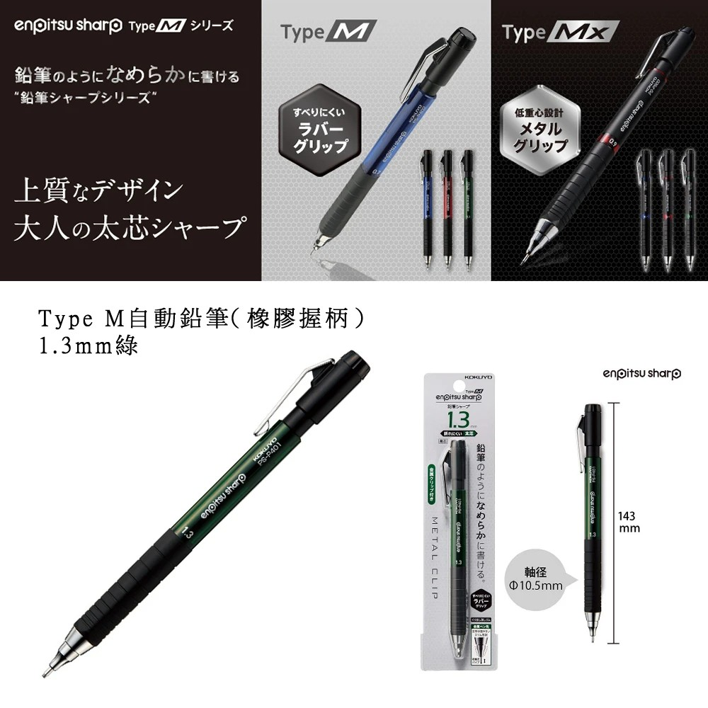 KOKUYO Type M 自動筆橡膠柄 1.3mm 綠色筆桿, 1支