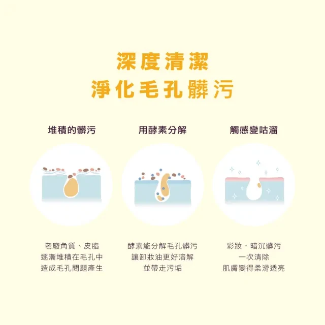 - 酵素配方深入毛孔,輕鬆溶解頑固彩妝與髒污,讓肌膚徹底潔淨。