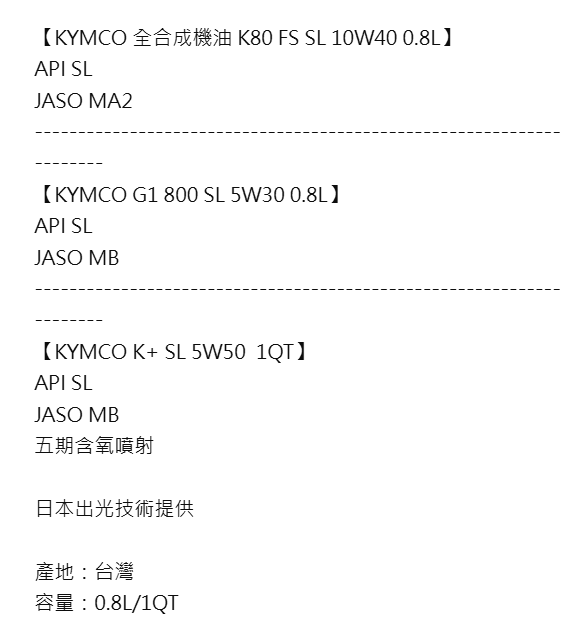 KYMCO 光陽全合成機油 G1 800 SL 5W30,為您的愛車提供卓越的引擎保護。這款800ml的機油採用全合成配方,確保在各種駕駛條件下都能提供優異的潤滑效果,減少引擎磨損,延長引擎壽命。SL 5W30的黏度等級,使其在低溫啟動時也能迅速流動,在高溫環境下保持穩定,提供全方位的保護。適用於多種機車引擎,符合API SL和JASO MB標準,品質值得信賴。選擇KYMCO G1 800,讓您的愛車引擎保持最佳狀態。