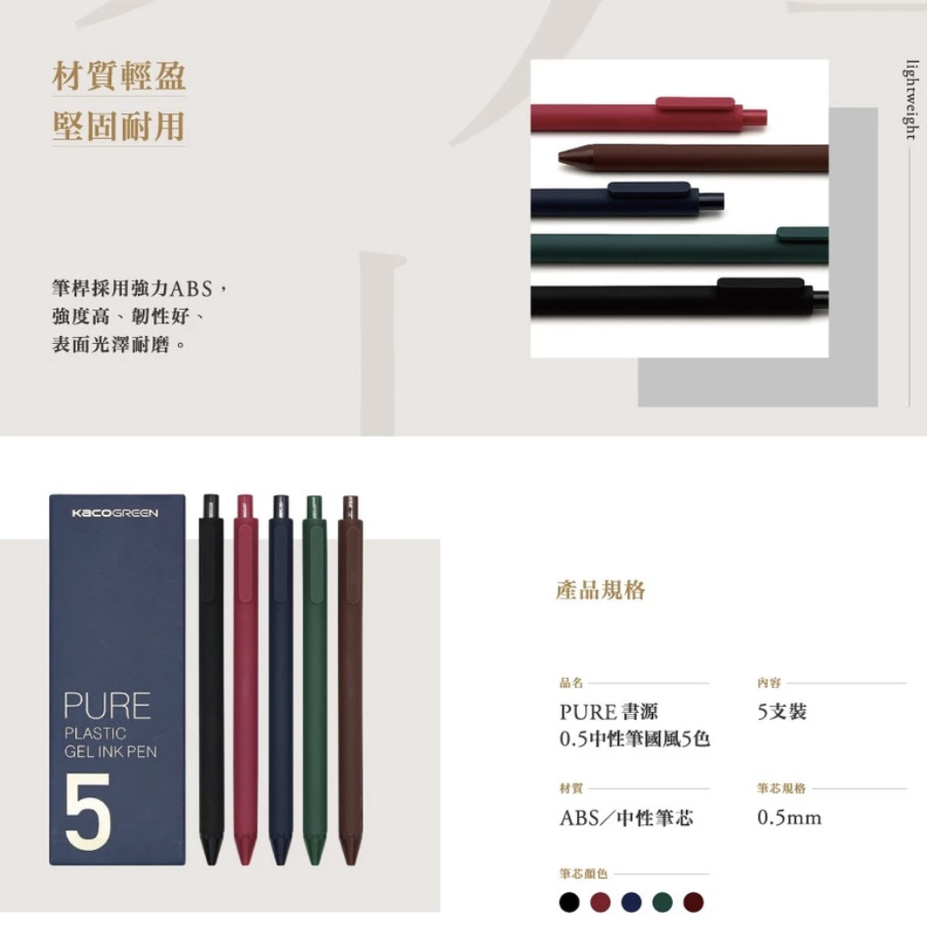 KACO PURE 書源中性筆套裝,以國風貳 + 桃花源為主題,包含五支色彩柔和的0.5mm中性筆,為您的書寫體驗增添一抹文藝氣息。筆身採用輕盈耐用的ABS材質,握感舒適,書寫流暢,讓您在記錄靈感或日常書寫時都能享受順滑體驗。無論是學生、上班族或是文藝愛好者,這款筆都能滿足您對書寫工具的品質與美感追求。精美盒裝設計,自用送禮皆宜,展現您的獨特品味。讓KACO PURE中性筆陪伴您,書寫每一個精彩瞬間。