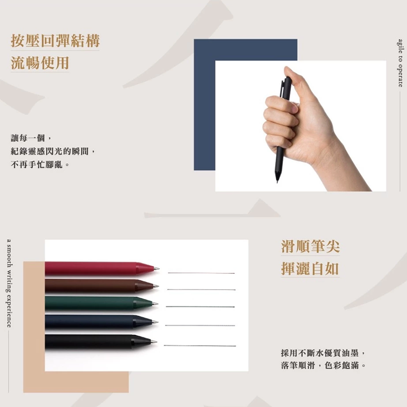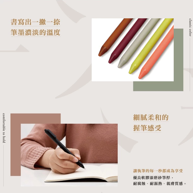 - 筆身設計符合人體工學,握感舒適,長時間書寫也不易感到疲勞,讓您享受書寫的樂趣。