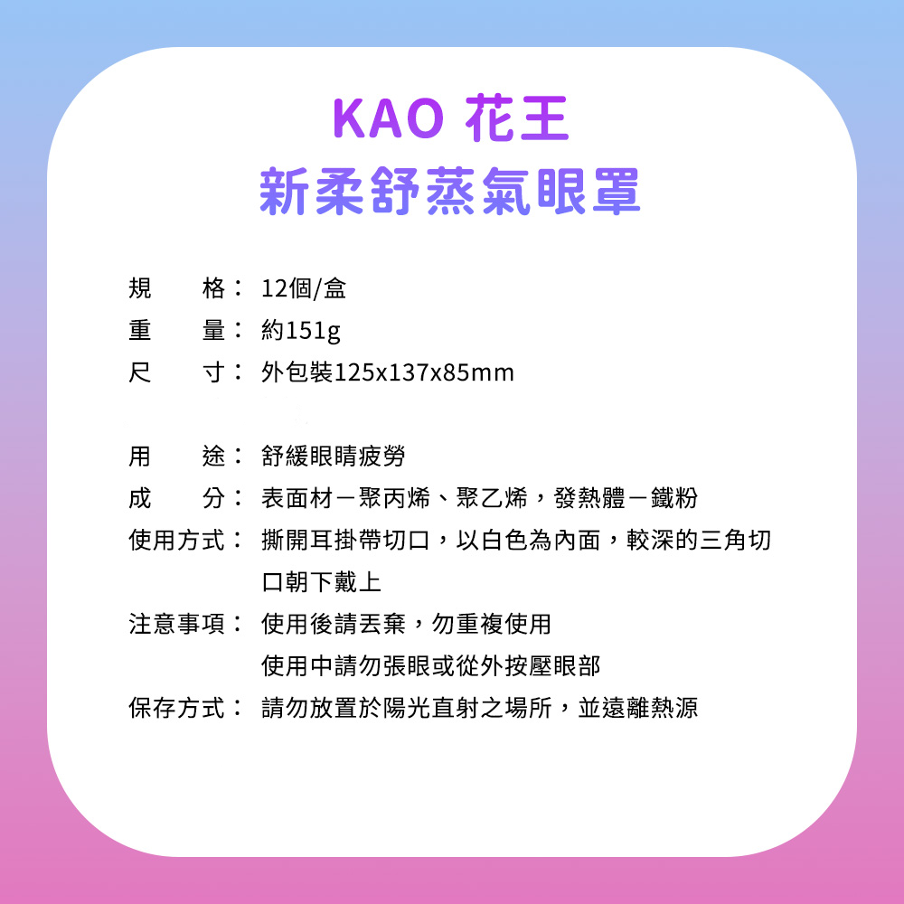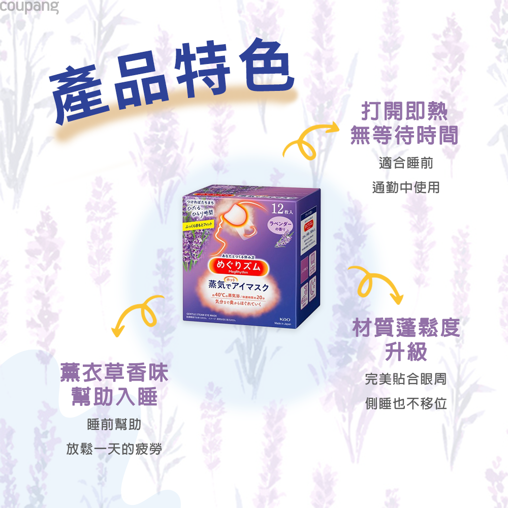- 花王美舒律眼罩,薰衣草香氛,輕柔呵護您的雙眼,享受舒適的睡眠體驗。