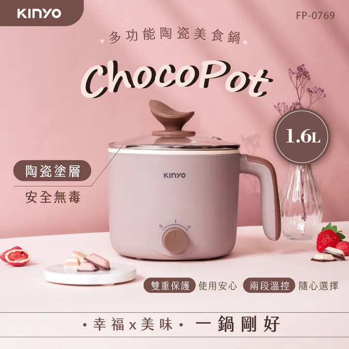 KINYO 多功能陶瓷美食鍋,型號FP-0769,是您廚房裡不可或缺的實用小幫手。這款美食鍋採用陶瓷內膽,讓您安心烹煮各式料理。1.6L的容量,無論是單人享用或是小家庭聚餐都非常適合,包含傾倒斷電與過熱保護,使用更安心。兩段溫控設計,可依據食材調整火力,輕鬆烹調出美味佳餚。鍋身輕巧,方便收納,讓您隨時享受烹飪的樂趣。