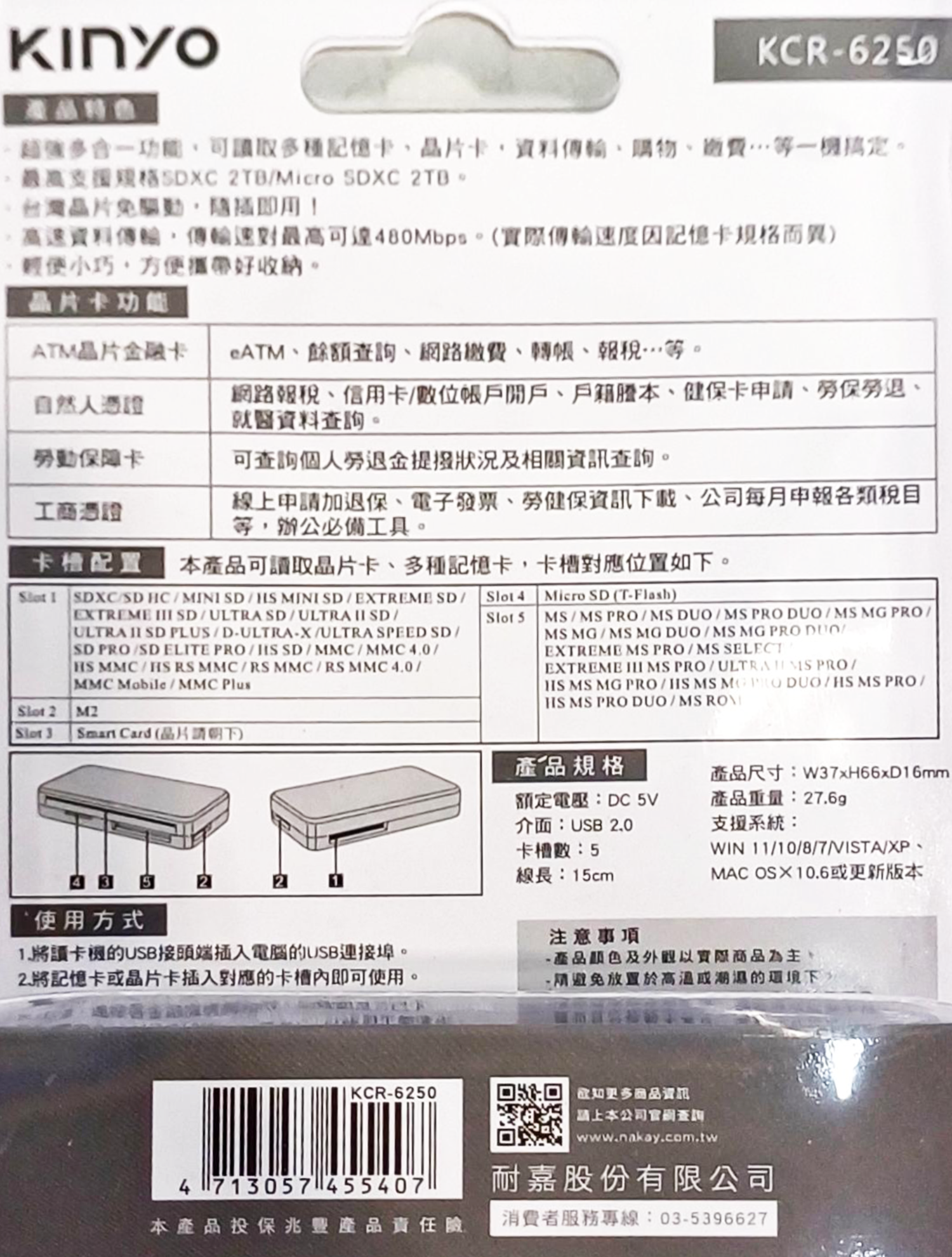 - KINYO多合一讀卡機,支援多種記憶卡格式,方便資料傳輸與備份,隨插即用。