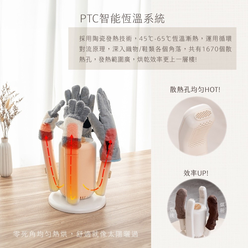 Kinyo 烘不讓多功能烘乾機 KSD-802 是一款高效便捷的家用小幫手,採用四支架設計,可同時烘乾多件物品,無論是潮濕的鞋襪、手套,甚至是安全帽,都能輕鬆應對。其伸縮風管設計,靈活調整烘乾角度,確保每個角落都能均勻受熱,達到最佳烘乾效果,有效抑制細菌滋生,讓您穿戴更安心。定時功能可根據不同物品調整烘乾時間,節能省電,安全阻燃的ABS材質,使用更放心。收納方便,不佔空間,是現代家庭的理想選擇。