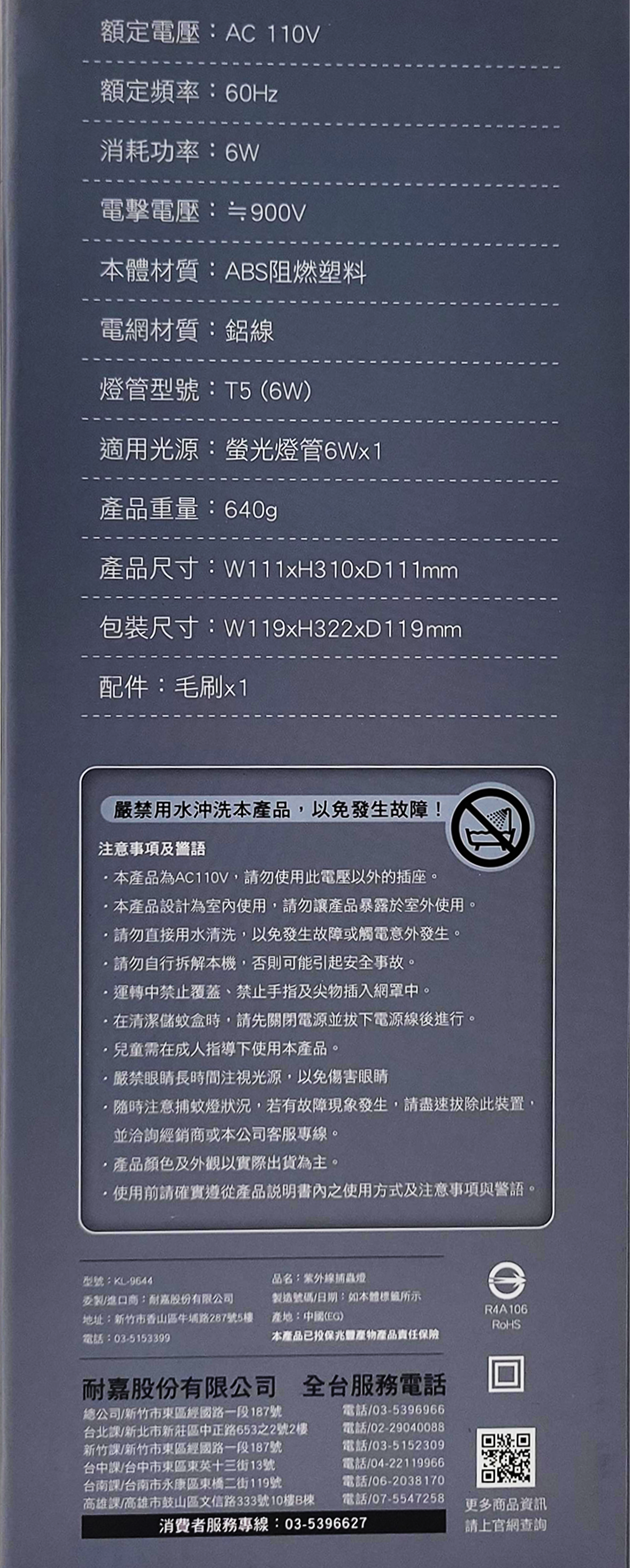 Kinyo 6W 電擊式捕蚊燈,型號KL-9644,以藍色外觀設計,為您的居家環境帶來清新感。這款捕蚊燈採用6W功率,利用UVA紫外光吸引蚊蟲,再以電擊方式高效滅蚊,讓您擺脫蚊蟲困擾,享受寧靜舒適的生活。產品尺寸為11.1 x 11.1 x 31公分,重量僅640克,輕巧不佔空間,適合放置於臥室、客廳或辦公室等各種室內場所。此外,產品附贈毛刷,方便您清潔蚊蟲殘骸,保持捕蚊燈的衛生與效能。採用物理滅蚊方式,守護您和家人的健康。