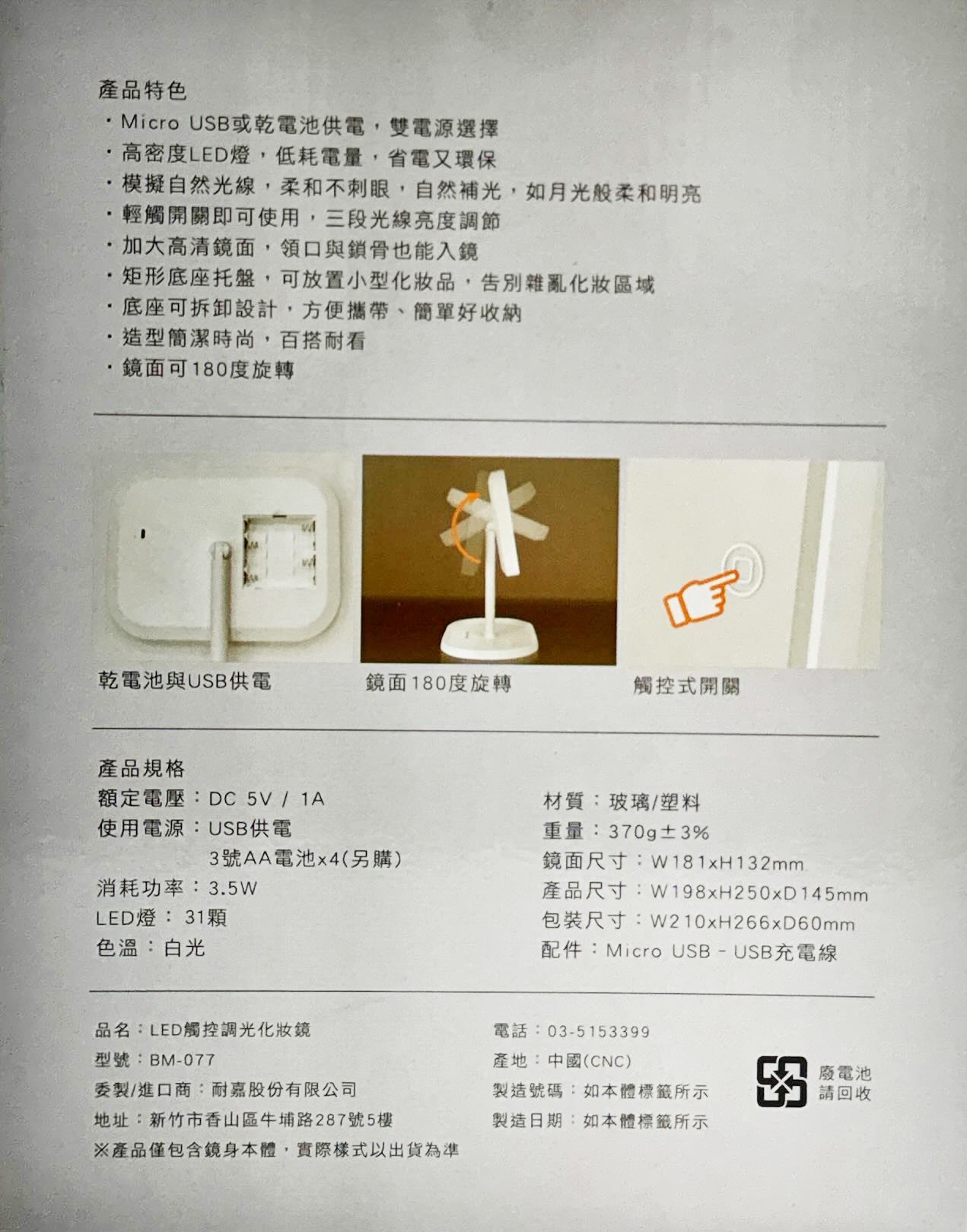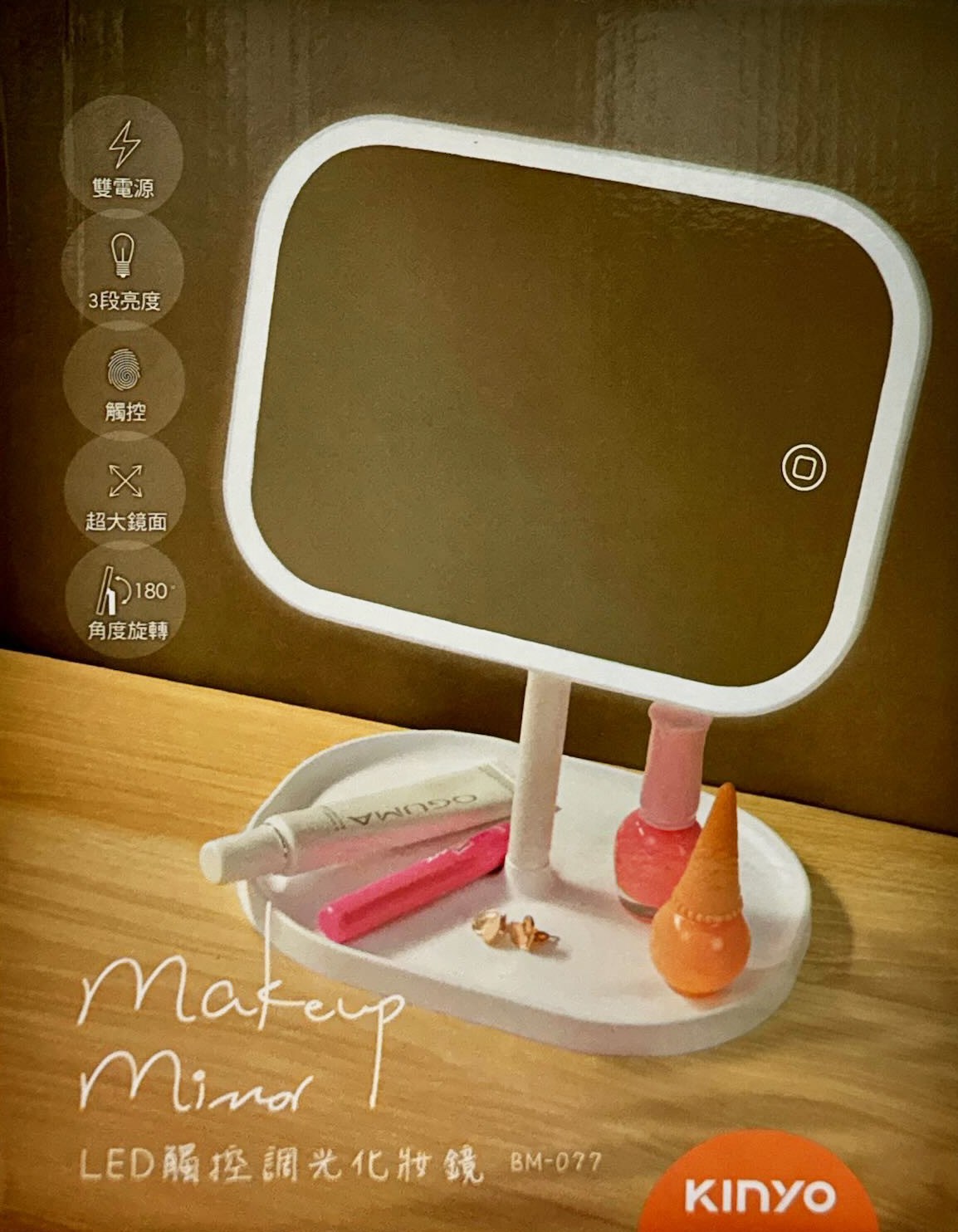 - 觸控式亮度調整,輕輕一按即可調整光線,滿足不同場合的化妝需求,讓妝容更精緻。