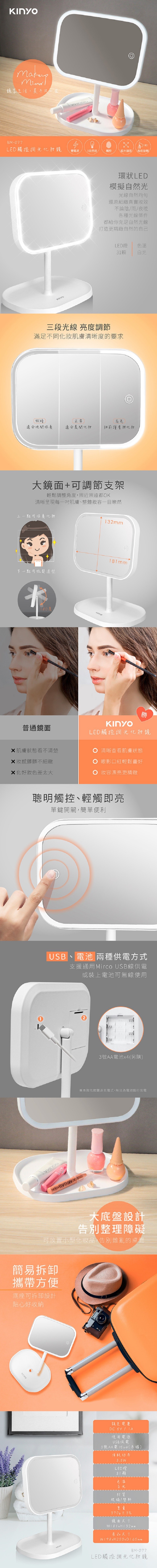 KINYO LED觸控調光化妝鏡,讓您在任何光線下都能精準上妝。這款時尚的白色化妝鏡,配備觸控調光功能,可輕鬆調整三段亮度,模擬自然光線,讓妝容更自然。其180度旋轉鏡面,搭配可拆卸底座設計,方便攜帶和收納。底座還可放置小型化妝品,告別雜亂的化妝區域。無論是USB供電還是乾電池供電,雙電源選擇讓您隨時隨地都能使用,是您化妝的最佳夥伴。