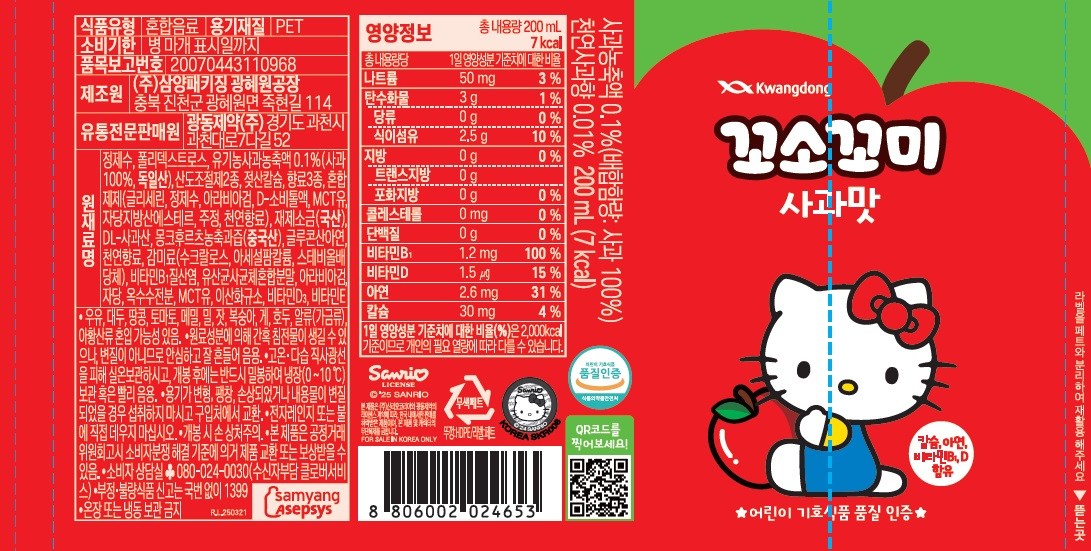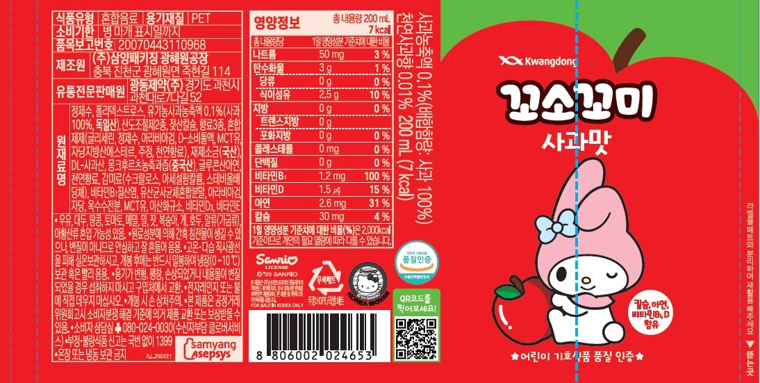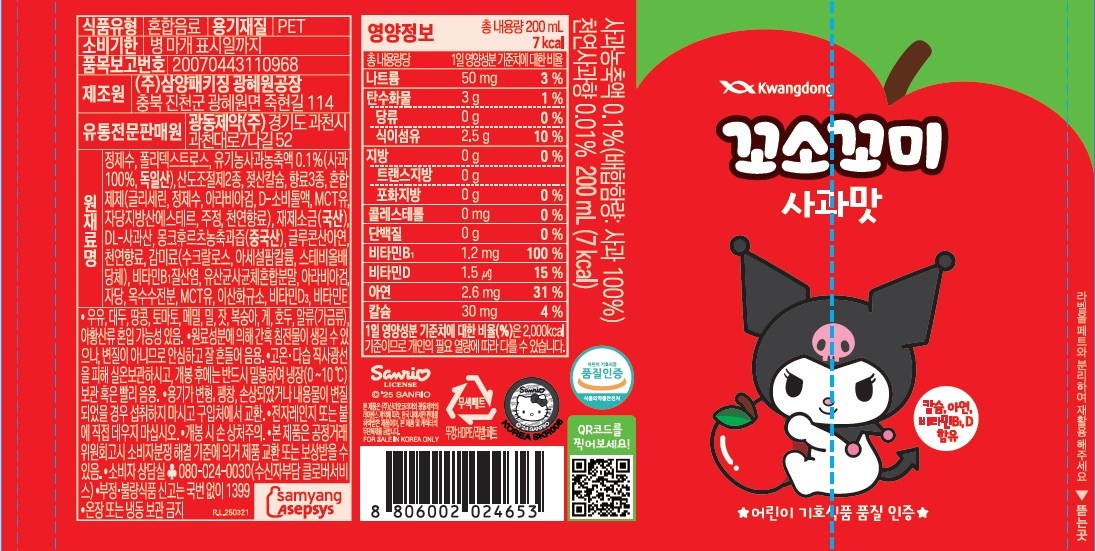 Kwangdong香香寶蘋果口味兒童飲料,是專為孩子設計的健康飲品。嚴選優質蘋果濃縮液,口感自然清甜,富含鈣、鋅、維生素B1、D等多種營養素,有助於孩子健康成長。本產品通過兒童喜好食品品質認證,不含人工色素及有害添加劑,讓孩子喝得開心,家長更安心。獨立包裝,方便攜帶,隨時隨地補充水分與活力。讓您的孩子在享受美味的同時,也能獲得均衡的營養。