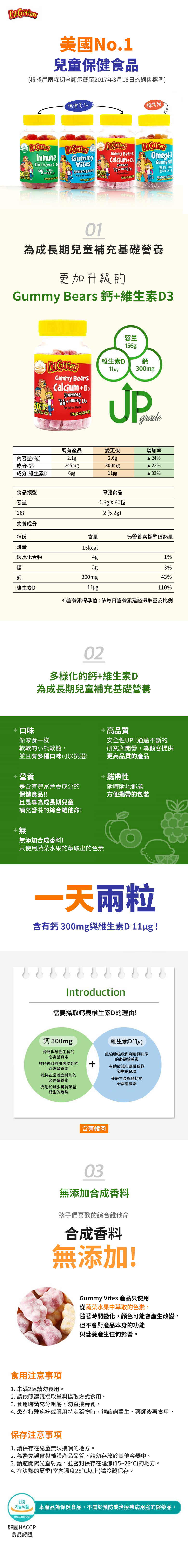 - L'il Critters小熊軟糖,鈣質與維生素D3結合,促進兒童骨骼與牙齒健康發展。