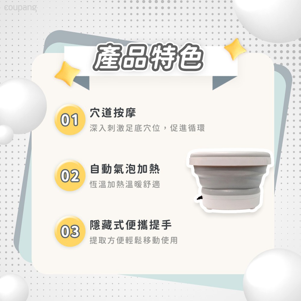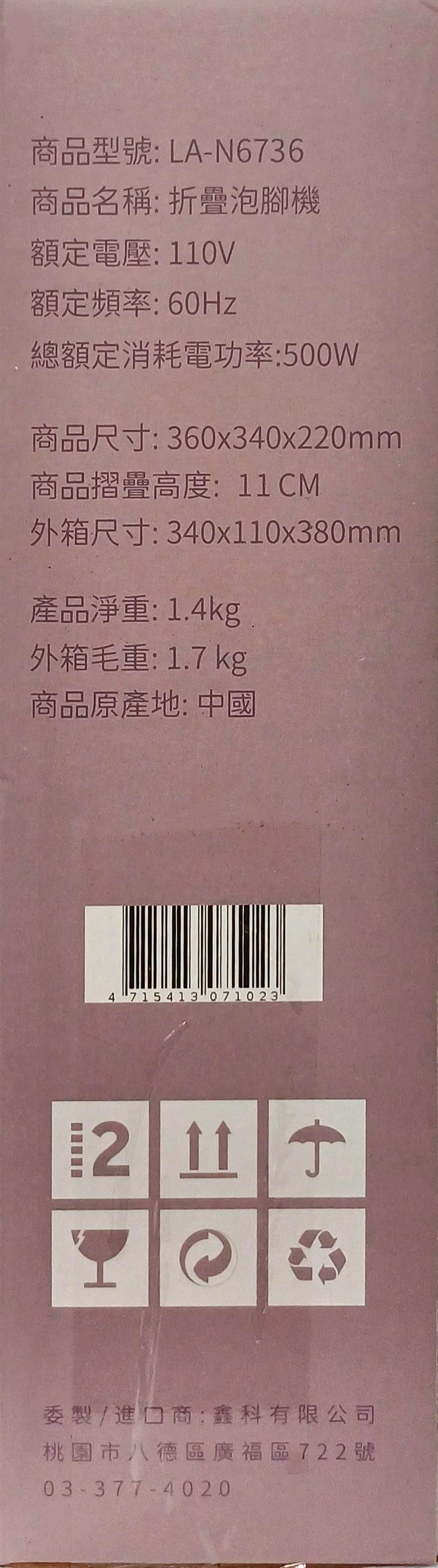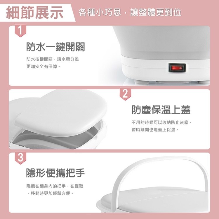 LA POLO 藍普諾折疊泡腳機,讓您在家也能享受SPA級的足部護理。這款泡腳機採用可折疊設計,收納不佔空間,重量僅1.4公斤,方便攜帶。它具備氣泡按摩功能,能深層刺激足底穴位,舒緩疲勞。此外,它還配備紅外線燈,有助於溫熱足部,提升舒適感。500W功率提供穩定的加熱效果,讓您在舒適的溫度下享受泡腳樂趣。產品尺寸為360*340*220mm,展開後容量充足,可輕鬆浸泡雙腳。