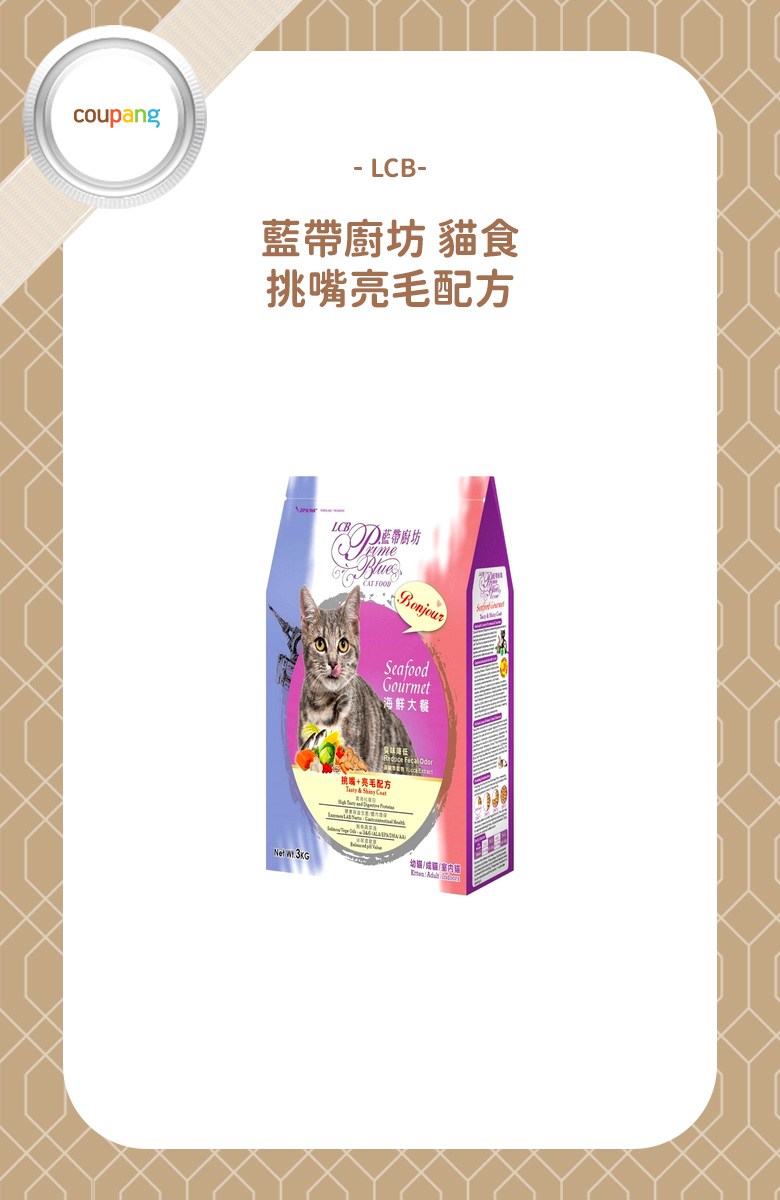 LCB 藍帶廚坊海鮮大餐貓糧,為您的愛貓提供美味又營養的膳食選擇。這款貓糧特別針對挑嘴貓和需要亮毛護理的貓咪設計,選用優質海鮮食材,提供豐富的蛋白質和Omega脂肪酸,有助於促進毛髮健康亮麗。無論是幼貓、成貓還是室內貓,都能享受這款美味又健康的貓糧。3公斤的包裝,方便儲存和餵食,讓您的愛貓隨時都能享受到海鮮的美味。