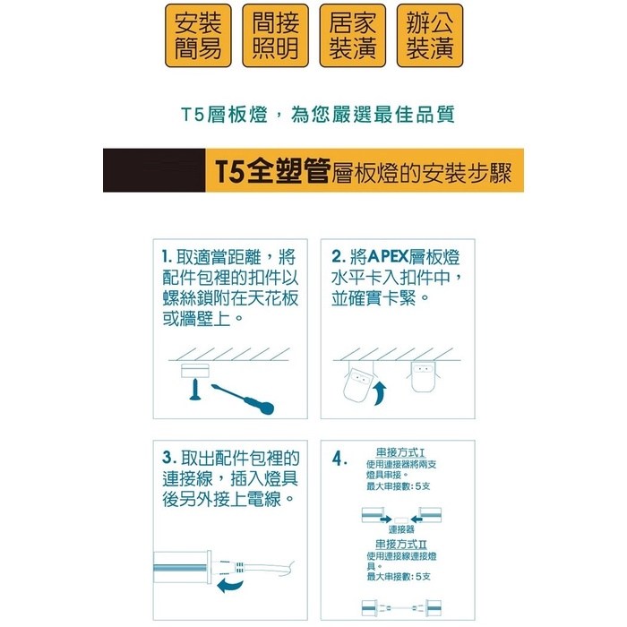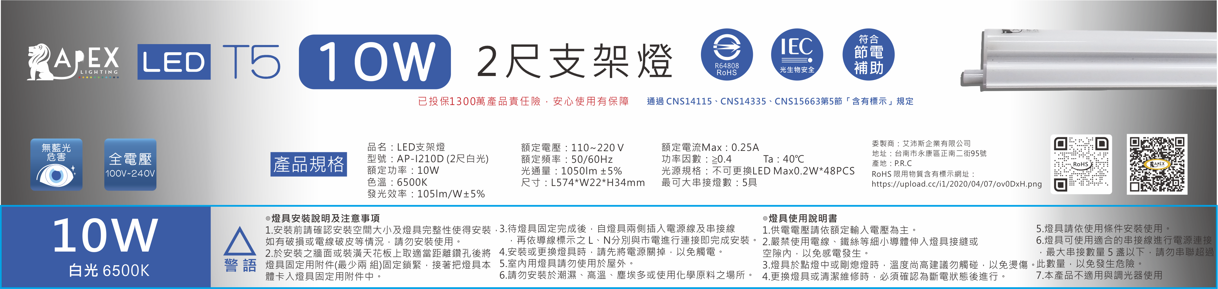 APEX LED T5 2尺支架燈 10W 6500K, 白光, 1個