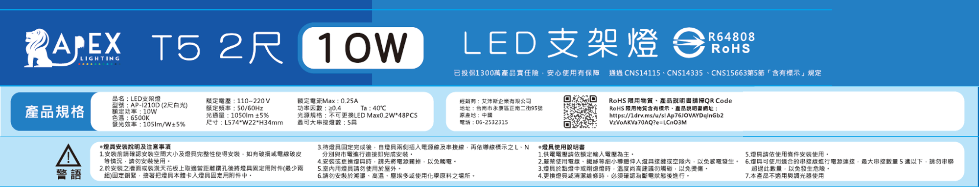 這款AP-I210D T5二尺10W全塑支架燈,以其白光6500K的明亮光線,為您的空間帶來清新活力。全塑材質不僅輕巧耐用,讓您使用更安心。此LED支架燈適用於110~220V電壓,安裝簡便,即插即用,無需複雜的接線工程。其10W的低功耗設計,同時提供穩定的照明效果,是居家、辦公室等場所的理想選擇。無論是間接照明還是直接照明,都能輕鬆營造舒適明亮的氛圍。