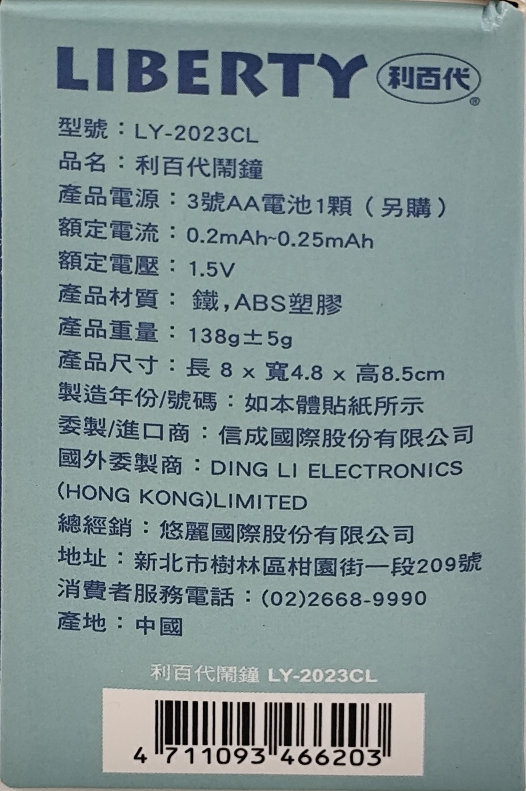 LIBERTY 利百代 LY-2023CL 鬧鐘,簡約設計,為您的桌面增添一份寧靜與時尚。採用靜音指針,告別滴答聲,讓您在安靜的環境中享受睡眠或工作。尺寸為 8 x 4.8 x 8.5 公分,小巧不佔空間,適合放置於床頭櫃或書桌上。此外,它還具備鬧鐘功能,讓您每天準時醒來,迎接美好的一天。使用鐵和 ABS 塑膠材質,堅固耐用,為您的生活提供長久的陪伴。本產品需使用 3 號 AA 電池一顆(需另購)。