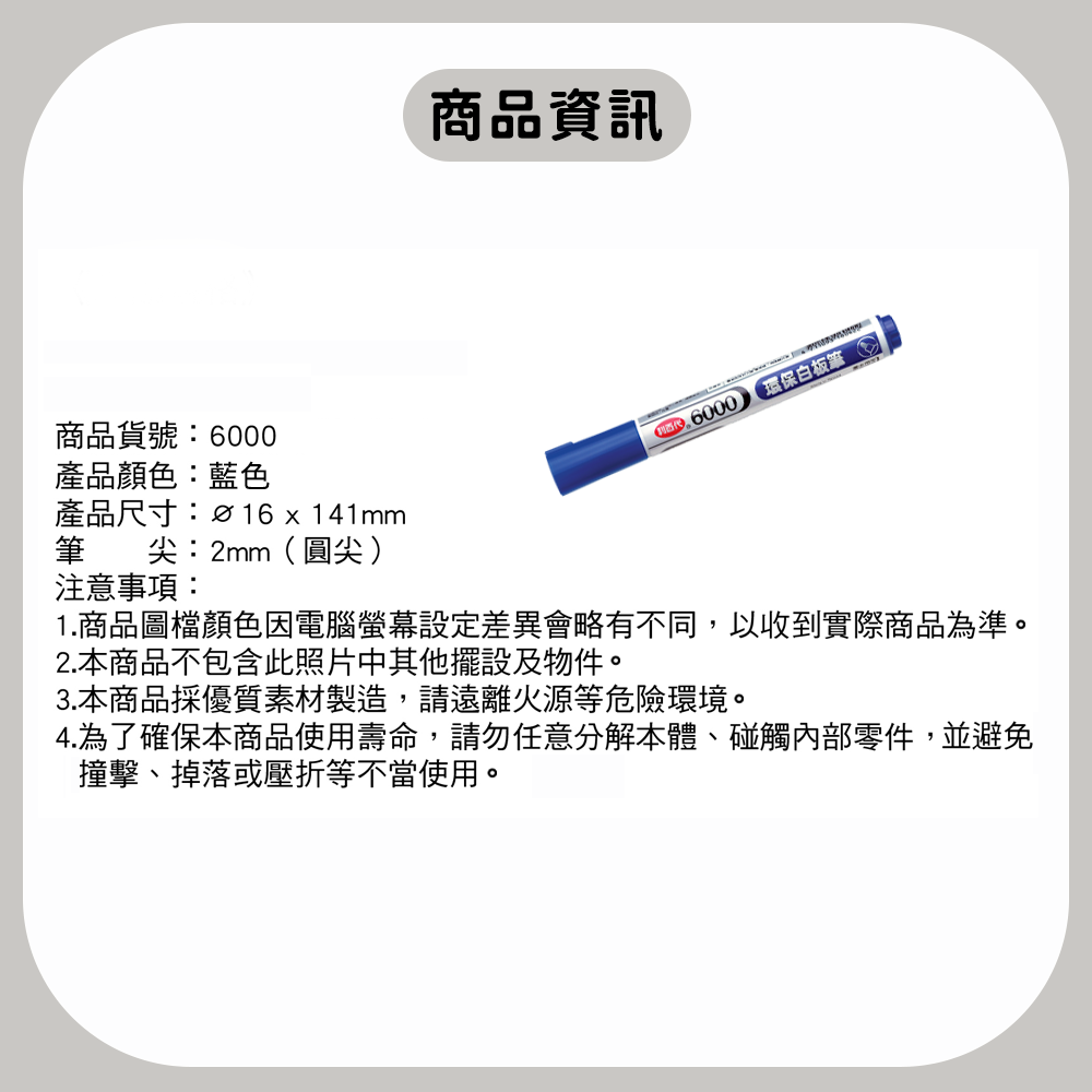 利百代6000環保白板筆,書寫流暢,色彩鮮明,讓您在教學、會議或日常書寫中都能輕鬆表達。藍色墨水醒目易見,適用於各種白板表面,易於擦拭,不留痕跡。此款白板筆為台灣製造,品質可靠,耐用性高,是您辦公室、學校或居家使用的理想選擇,也讓您使用更安心。無論是繪圖、筆記或重點標示。