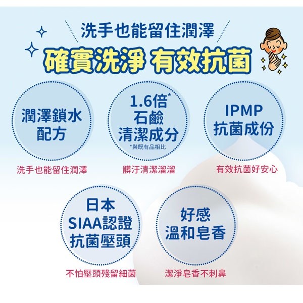 - 添加保濕成分,洗後雙手不乾澀,維持肌膚水潤度,讓您隨時擁有柔嫩健康的雙手。