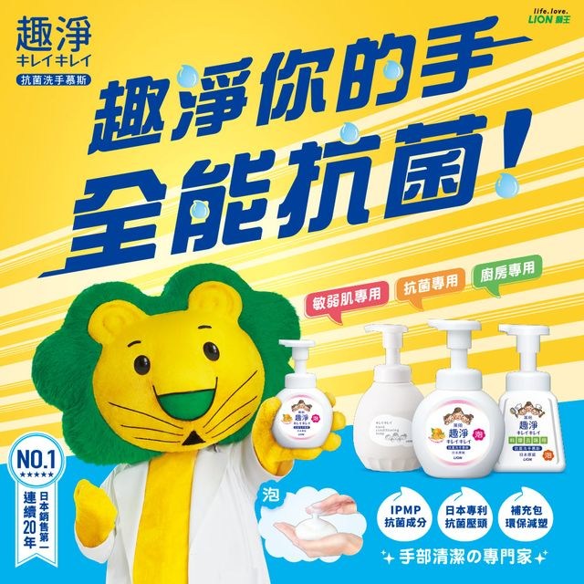 - 獅王趣淨慕斯泡沫細緻,輕鬆洗淨雙手,讓您享受潔淨的觸感,告別黏膩。