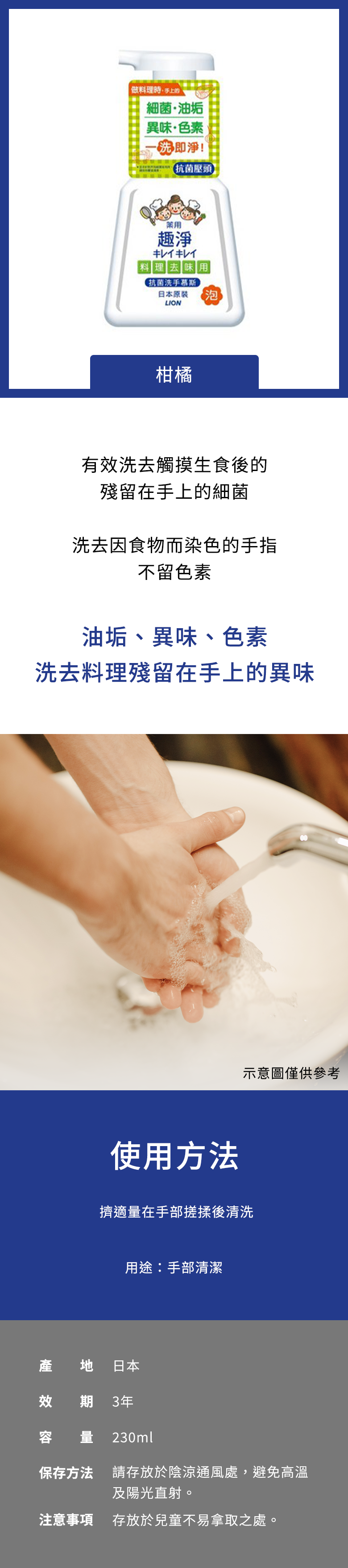 LION 獅王趣淨料理手抗菌去味慕斯,讓您在料理過程中也能保持雙手清潔衛生。這款柑橘香味的洗手慕斯,專為去除料理時殘留在手上的異味、油垢和細菌而設計。其獨特配方能有效洗淨蒜、生肉、海鮮等食材的味道,以及咖哩、醬料等造成的色素沉澱,讓您的雙手恢復潔淨清爽,能有效洗淨髒污細菌,使用更安心。容量為230ml,一瓶裝,是您廚房清潔不可或缺的好幫手。