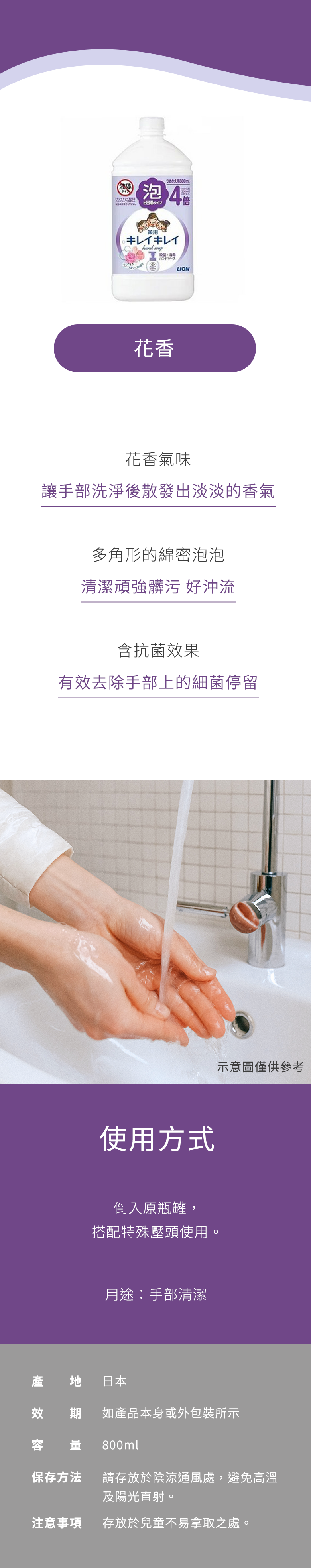 - 花香泡沫洗手慕斯,細緻泡沫深入毛孔,徹底清潔,洗後肌膚水潤不乾澀,帶來舒適感受。