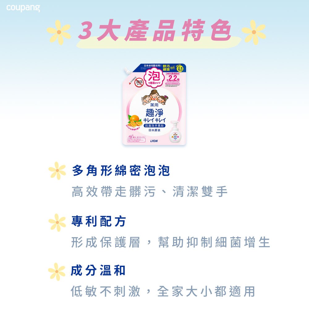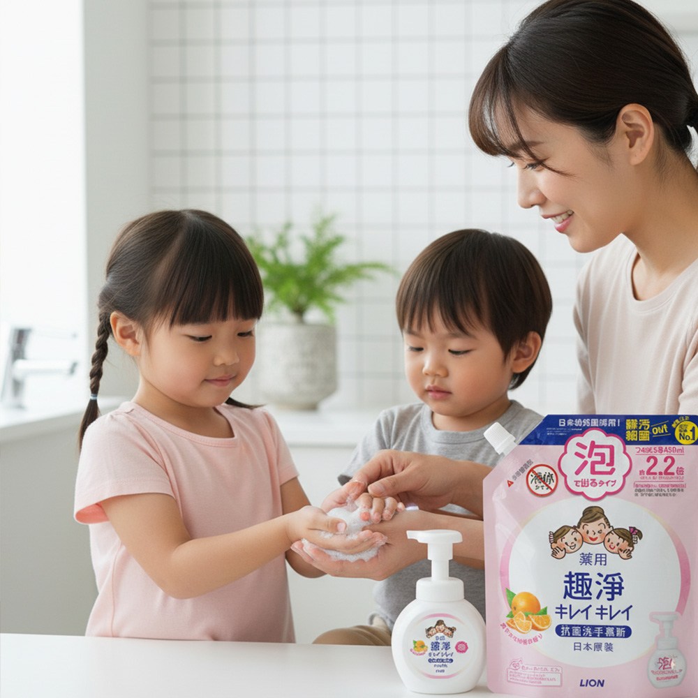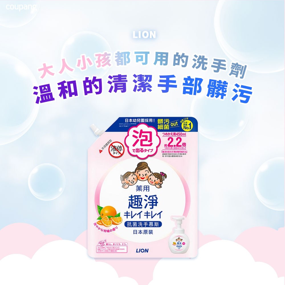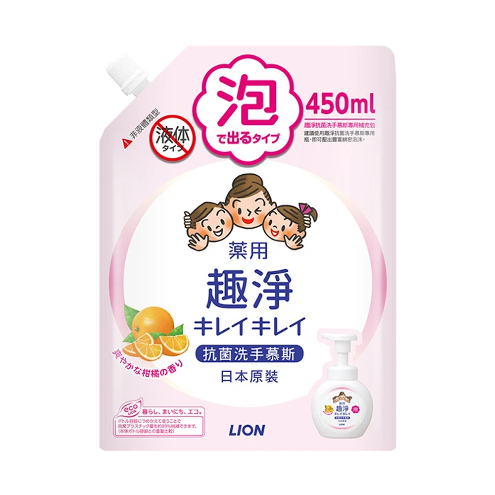 LION 獅王趣淨洗手慕斯補充包,清爽柑橘香氛,給您和家人帶來潔淨與愉悅的洗手體驗。450ml大容量補充包,經濟實惠,可節省替換次數,有效洗淨髒污細菌,守護全家人的健康。綿密泡沫溫和不刺激,大人小孩都適用,洗後雙手清爽不乾澀。日本原裝進口,品質保證,讓您安心使用。