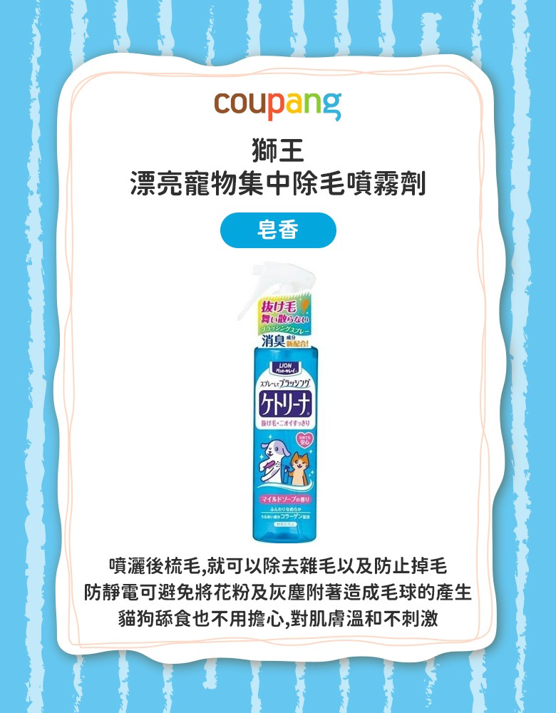 Lion 順毛芳香噴霧,為您的愛犬和愛貓提供溫和的清潔和護理。這款噴霧具有溫和的皂香,能有效去除寵物身上的異味,讓它們保持清新。配方中含有膠原蛋白,有助於滋潤毛髮,使其柔順光滑,減少毛髮打結和灰塵吸附。使用後,毛髮更容易梳理,減少掉毛,讓您的家居環境更加清潔。200ml 的容量,方便攜帶和使用,是您寵物日常護理的理想選擇。