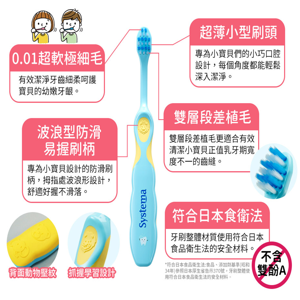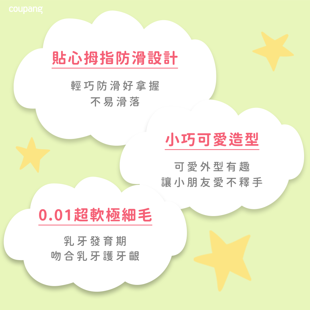 - 刷毛尖端柔軟纖細,深入清潔牙縫,呵護寶寶嬌嫩的牙齦,讓刷牙成為愉快的體驗。
