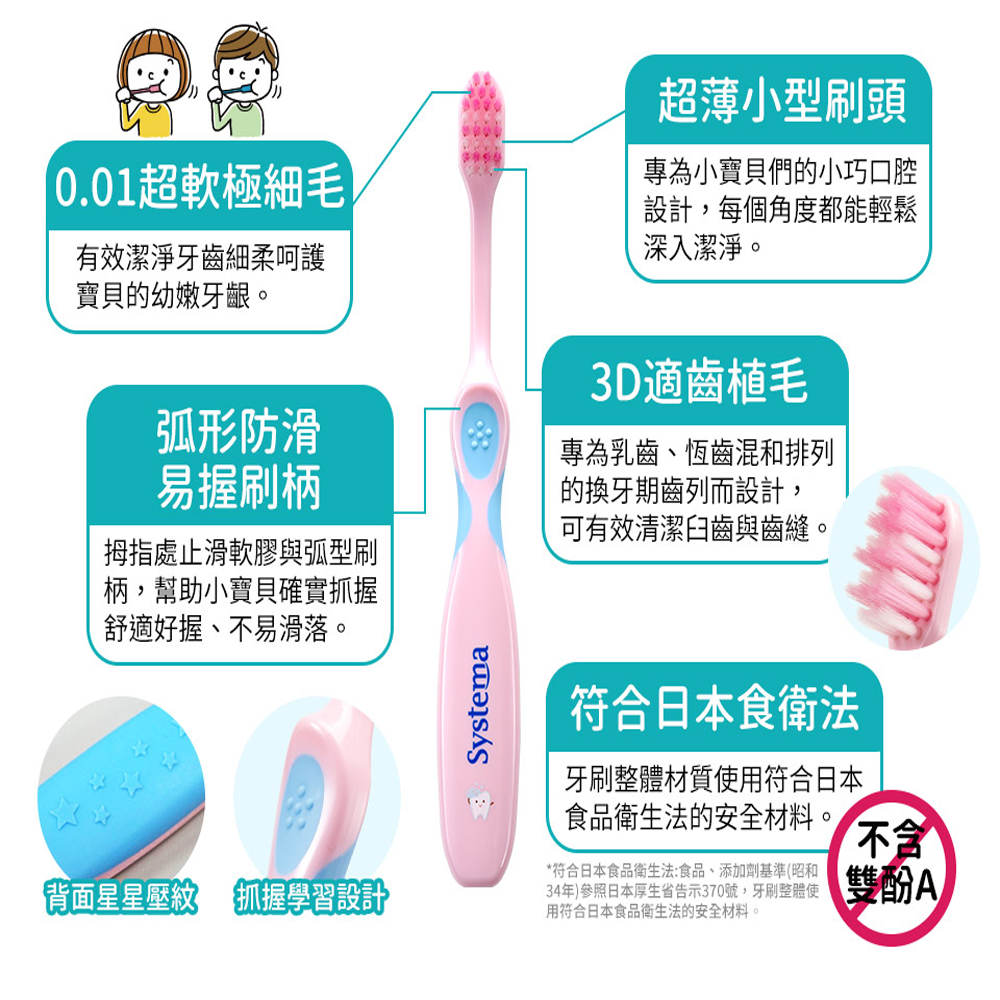 - 握柄採用防滑材質,符合人體工學設計,讓孩子輕鬆掌握,享受獨立刷牙的樂趣與成就感。