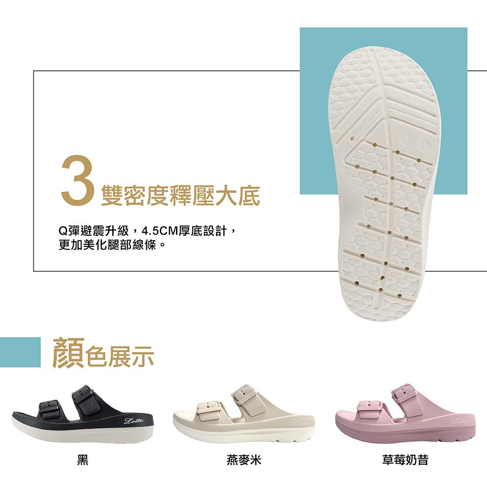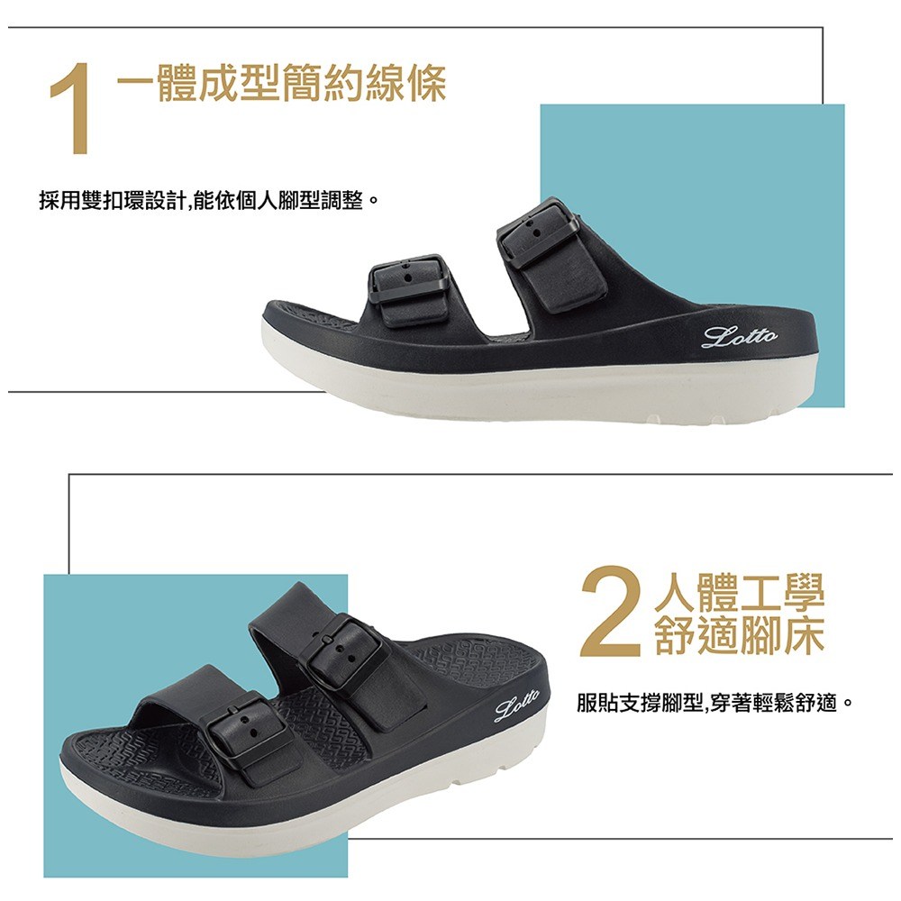 LOTTO樂得女款VENUS美形拖,採用符合人體工學的舒適腳床設計,讓您在家中或外出時都能享受輕鬆自在的穿著體驗。雙扣環設計可依個人腳型調整鬆緊度,確保穿著時的穩定性。簡約線條一體成型,展現時尚美感,4.5公分厚底設計,能有效修飾腿部線條。Q彈避震大底,提供良好的緩衝效果,減輕行走時對腳部的壓力,是您居家休閒或外出穿搭的理想選擇。