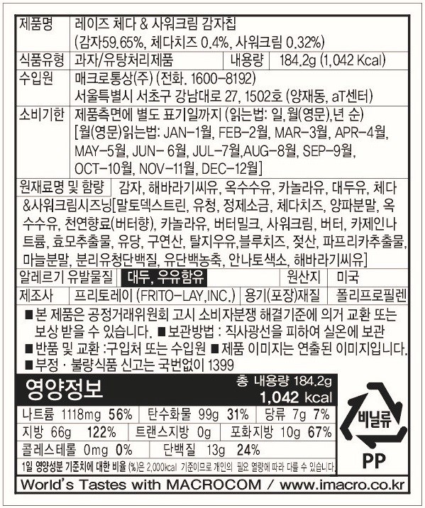成分:馬鈴薯、葵花籽油、玉米油、芥花油、大豆油、切達&酸奶洋蔥調味料[麥芽糊精、乳清、精鹽、切達起司、洋蔥粉、玉米油、香料(奶油香)、芥花油、酪乳、酸奶油、奶油、酪蛋白鈉、酵母萃取物、乳糖、檸檬酸、脫脂牛奶、藍紋起司、乳酸、彩椒萃取色素、大蒜粉、分離乳清蛋白質、濃縮乳蛋白、胭脂樹紅色素、葵花籽油]