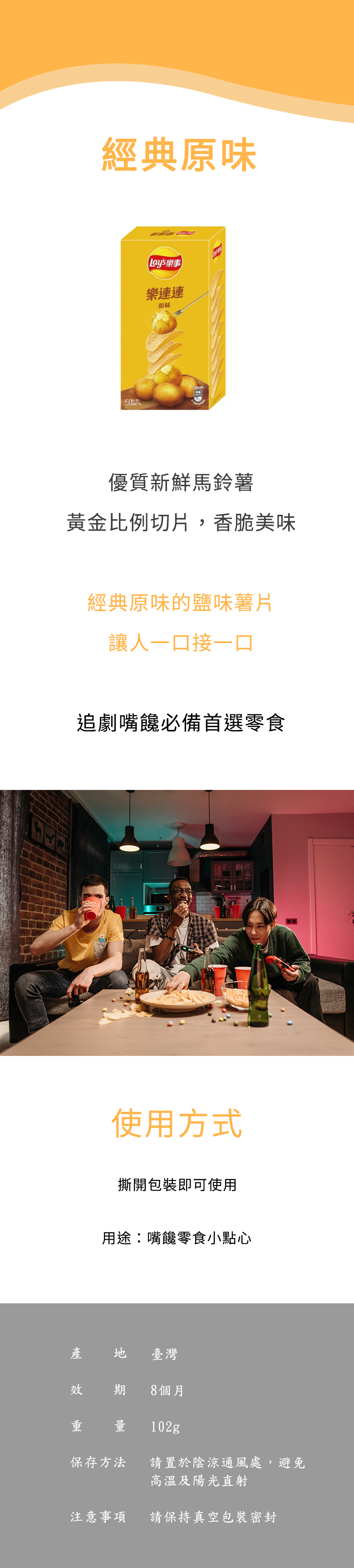 - 樂事原味洋芋片,酥脆口感在口中蔓延,帶來簡單而純粹的味覺享受。