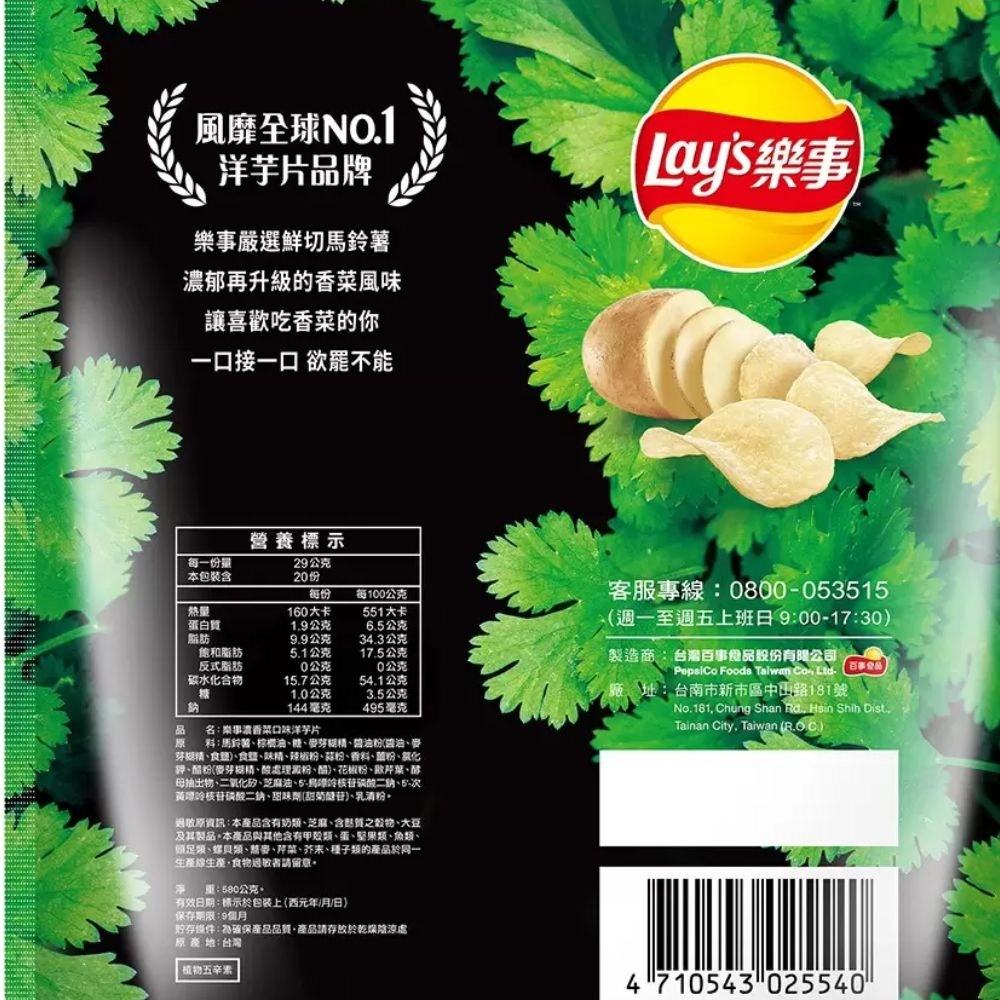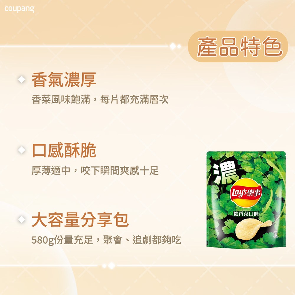 - 樂事濃香菜風味洋芋片,獨特香菜風味,口感豐富,令人回味無窮。