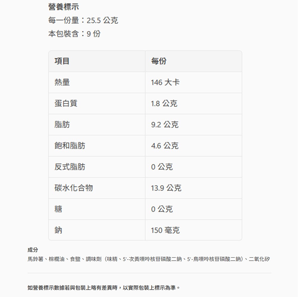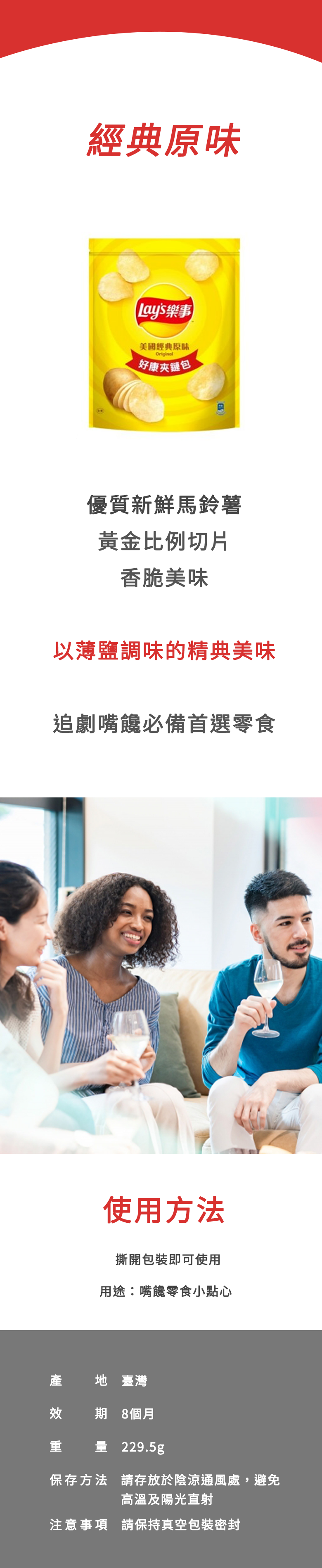 樂事經典原味洋芋片,採用優質新鮮馬鈴薯,以黃金比例切片,薄鹽調味,香脆美味。一箱包含六包,每包229.5克,份量十足,是追劇、聚會時的最佳零食選擇。樂事洋芋片產地台灣,開封即可食用,保存期限長達8個月,讓您隨時享受美味。請存放於陰涼通風處,避免高溫及陽光直射,並保持真空包裝密封,確保最佳口感。