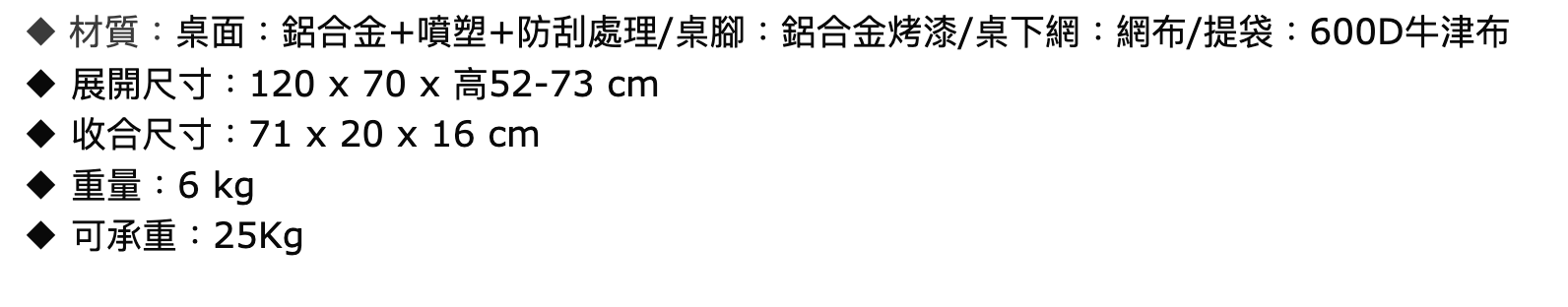 - 鋁合金材質堅固耐用,讓您在戶外使用時更加安心,不必擔心桌面損壞影響用餐體驗。
