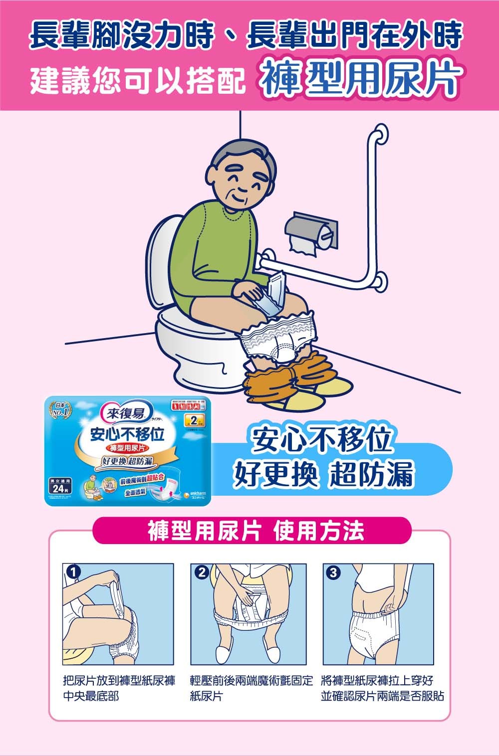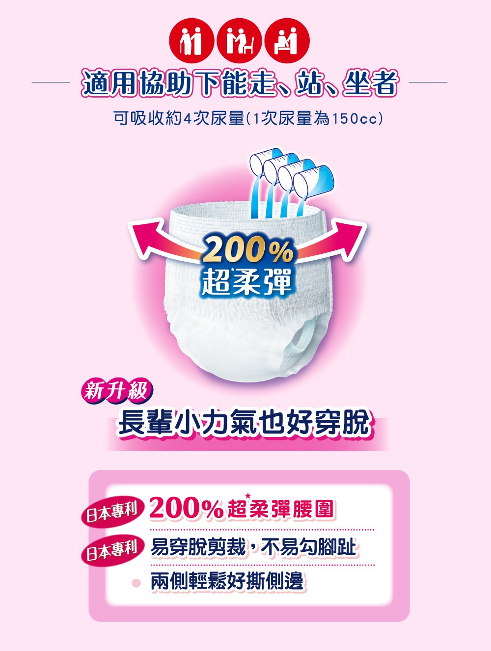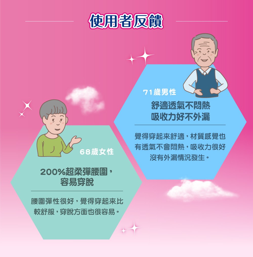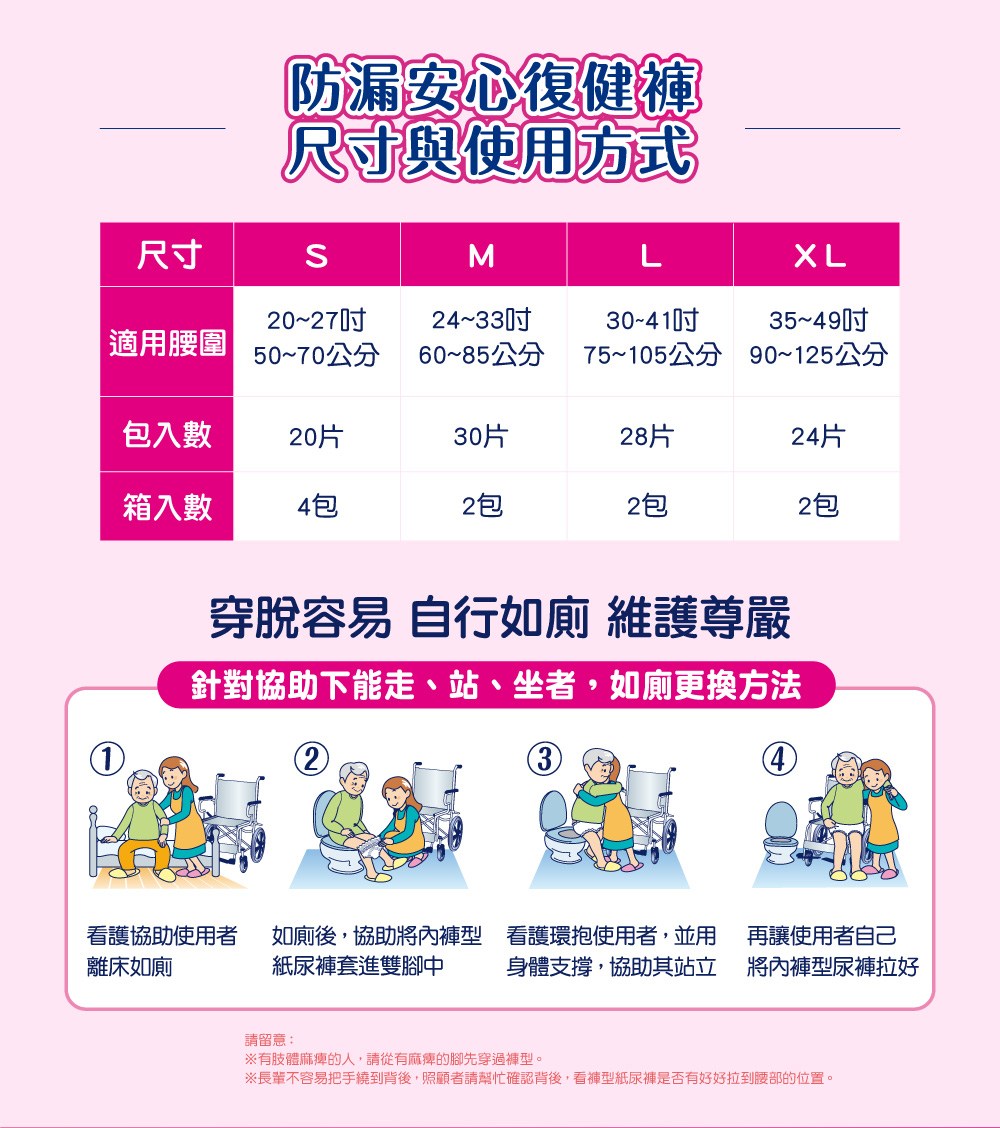 - 獨特腿窩與背部柔貼防漏側邊設計,有效防止側漏,讓長輩活動自如,無後顧之憂,享受自在生活。