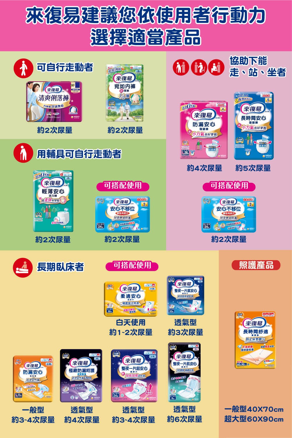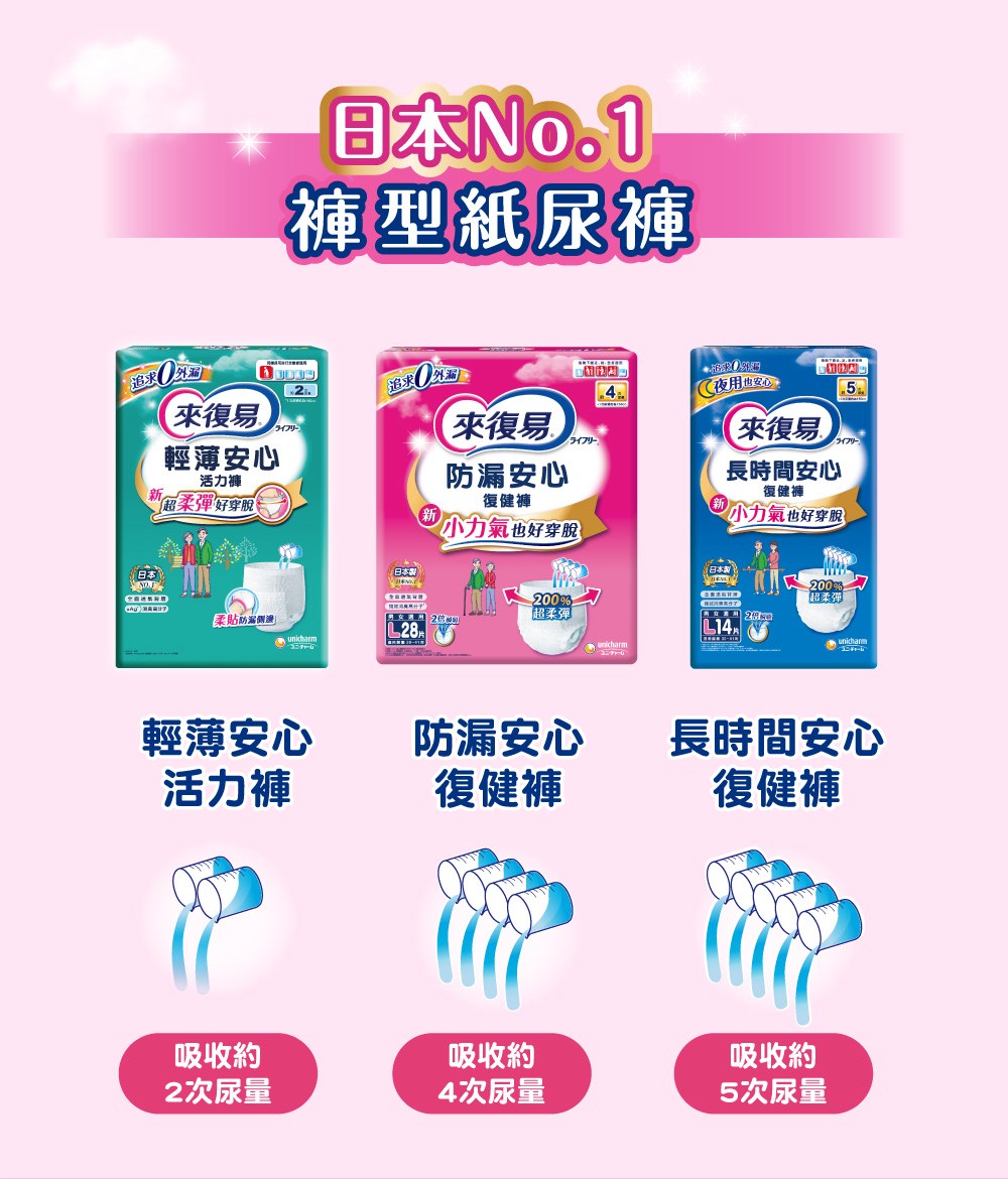 來復易防漏安心復健褲,專為行動不便但仍可站立或坐臥的長者設計。採用日本專利技術,具有200%超柔彈腰圍,穿脫容易,長輩小力氣也能輕鬆穿脫。2倍瞬吸設計,快速吸收尿液,保持乾爽舒適。腿窩與背部柔貼防漏側邊,有效防止側漏,給予長輩全方位的安心保護。全面透氣背層,保持乾爽不悶熱,強效消臭高分子,有效消除異味,讓長輩享受清新舒適的生活。
