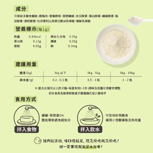 - 雞肉口味,美味可口,提高寵物的食慾,讓毛孩愛上每天的腸胃保健時光。