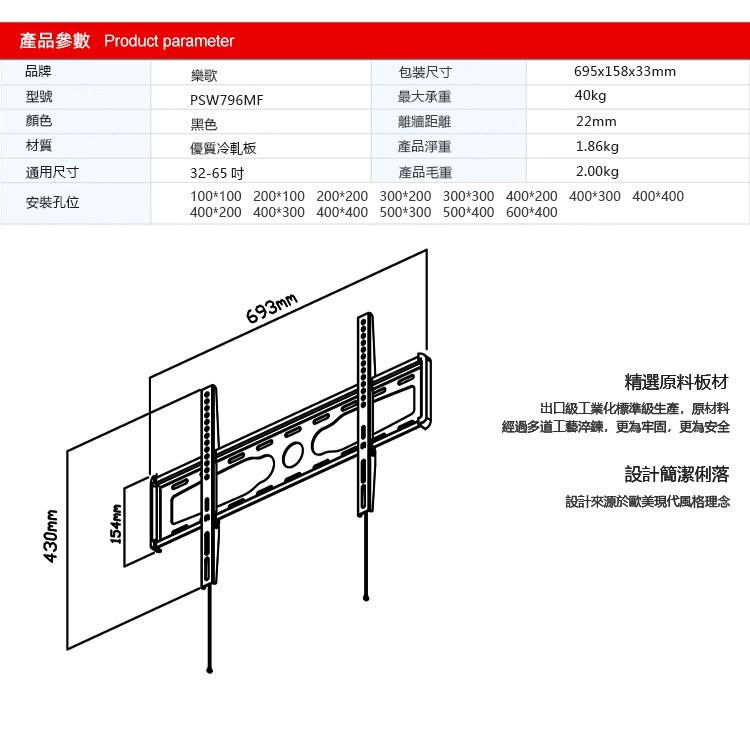 樂歌Loctek PSW796MF平板電視壁掛架,適用於32至65吋的電視,讓您輕鬆將電視安裝在牆上,節省空間並提升觀影體驗。這款壁掛架採用優質冷軋鋼板製成,堅固耐用,最大承重可達40公斤,確保電視安全穩固。其多孔位設計,兼容多種VESA標準,適用於市面上大多數電視品牌和型號。安裝簡便,配備水平儀和多種螺絲配件,讓您輕鬆完成安裝,享受更舒適的家庭影音娛樂。